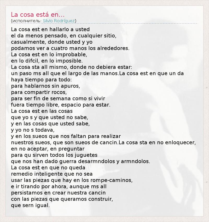 La cosa est en hallarlo a usted el da menos pensado, en cualquier sitio, casualmente, donde usted y yo podamos ver a cuatro manos los alrededores. La cosa est en lo improbable, en lo difcil, en lo imposible. La cosa sta all mismo, donde no debiera estar: un paso ms all que el largo de las manos.La cosa est en que un da haya tiempo para todo: para hablarnos sin apuros, para compartir rocos, para ser fin de semana como si vivir fuera tiempo libre, espacio para estar. La cosa est en las cosas que yo s y que usted no sabe, y en las cosas que usted sabe, y yo no s todava, y en los sueos que nos faltan para realizar nuestros sueos, que son sueos de cancin.La cosa sta en no enloquecer, en no aceptar, en preguntar para qu sirven todos los juguetes que nos han dado guerra desarmndolos y armndolos. La cosa est en que no queda remedio inteligente que no sea usar las piezas que hay en los rompe-caminos, e ir tirando por ahora, aunque ms all persistamos en crear nuestra cancin con las piezas que queramos construir, que sern igual.