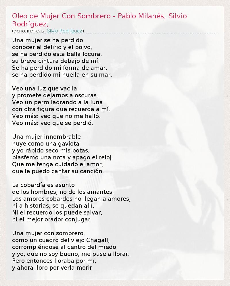 Una Mujer себе ха- Пердидо КОНОСЕР Эл Delirio у эль Polvo , SE га Пердидо Эста Белла Locura , су бревис Cintura debajo де mí . Se га Пердидо миль Форма де Амар , SE га Пердидо миль Huella ан су марта Настенный уна Лус Que vacila у Promete dejarnos в oscuras . Настенный ООН Перро ladrandoLa Luna кон Otra фигура Que recuerdamí . Настенный más : Настенный Que No меня Hallo . Настенный más : Настенный Que себе perdió . Una Mujer innombrable Huye Комо уна Чайка у лет rápido СЕКО MIS Botas , blasfemo уна Nota у apago эль Reloj . Que меня TENGA Cuidado эль амор , Que ле puedo Cantar су canción . La cobardía эс Asunto де-лос- Hombres , ни де-лос- AMANTES . Los Amores cobardes нет lleganAmores , NiHistorias , себе quedan Alli . Ni -эль Recuerdo лос Puede salvar , Ni -эль Mejor orador Conjugar . Una Mujer Con сомбреро , Комо ООН Cuadro дель Вьехо Шагал , corrompiéndose Al Centro дель Miedo у лет , Que No соевого Буэно, мне PUSE в Llorar . Перо entonces lloraba Por Mi , у Ahora Lloro POR Верла Morir