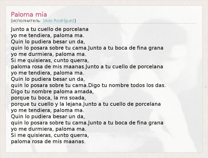 Junto a tu cuello de porcelana yo me tendiera, paloma ma. Quin lo pudiera besar un da, quin lo posara sobre tu cama.Junto a tu boca de fina grana yo me durmiera, paloma ma. Si me quisieras, cunto querra, paloma rosa de mis maanas.Junto a tu cuello de porcelana yo me tendiera, paloma ma. Quin lo pudiera besar un da, quin lo posara sobre tu cama.Digo tu nombre todos los das. Digo tu nombre paloma amada, porque tu boca, la ms soada, porque tu cuello y la lejana.Junto a tu cuello de porcelana yo me tendiera, paloma ma. Quin lo pudiera besar un da, quin lo posara sobre tu cama.Junto a tu boca de fina grana yo me durmiera, paloma ma. Si me quisieras, cunto querra, paloma rosa de mis maanas.