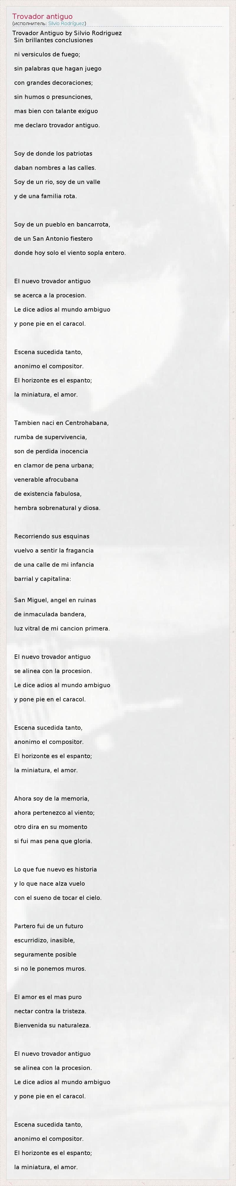 Trovador Antiguo by Silvio Rodriguez Sin brillantes conclusiones ni versiculos de fuego; sin palabras que hagan juego con grandes decoraciones; sin humos o presunciones, mas bien con talante exiguo me declaro trovador antiguo. Soy de donde los patriotas daban nombres a las calles. Soy de un rio, soy de un valle y de una familia rota. Soy de un pueblo en bancarrota, de un San Antonio fiestero donde hoy solo el viento sopla entero. El nuevo trovador antiguo se acerca a la procesion. Le dice adios al mundo ambiguo y pone pie en el caracol. Escena sucedida tanto, anonimo el compositor. El horizonte es el espanto; la miniatura, el amor. Tambien naci en Centrohabana, rumba de supervivencia, son de perdida inocencia en clamor de pena urbana; venerable afrocubana de existencia fabulosa, hembra sobrenatural y diosa. Recorriendo sus esquinas vuelvo a sentir la fragancia de una calle de mi infancia barrial y capitalina: San Miguel, angel en ruinas de inmaculada bandera, luz vitral de mi cancion primera. El nuevo trovador antiguo se alinea con la procesion. Le dice adios al mundo ambiguo y pone pie en el caracol. Escena sucedida tanto, anonimo el compositor. El horizonte es el espanto; la miniatura, el amor. Ahora soy de la memoria, ahora pertenezco al viento; otro dira en su momento si fui mas pena que gloria. Lo que fue nuevo es historia y lo que nace alza vuelo con el sueno de tocar el cielo. Partero fui de un futuro escurridizo, inasible, seguramente posible si no le ponemos muros. El amor es el mas puro nectar contra la tristeza. Bienvenida su naturaleza. El nuevo trovador antiguo se alinea con la procesion. Le dice adios al mundo ambiguo y pone pie en el caracol. Escena sucedida tanto, anonimo el compositor. El horizonte es el espanto; la miniatura, el amor.