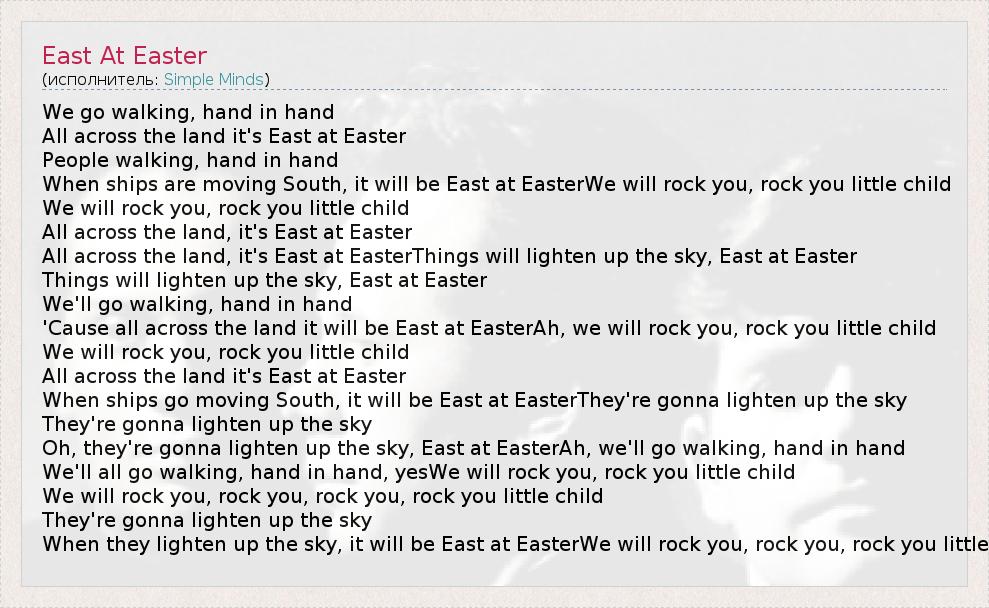 Oh, they're gonna lighten up the sky, East at EasterAh, we'll go walking, hand in hand