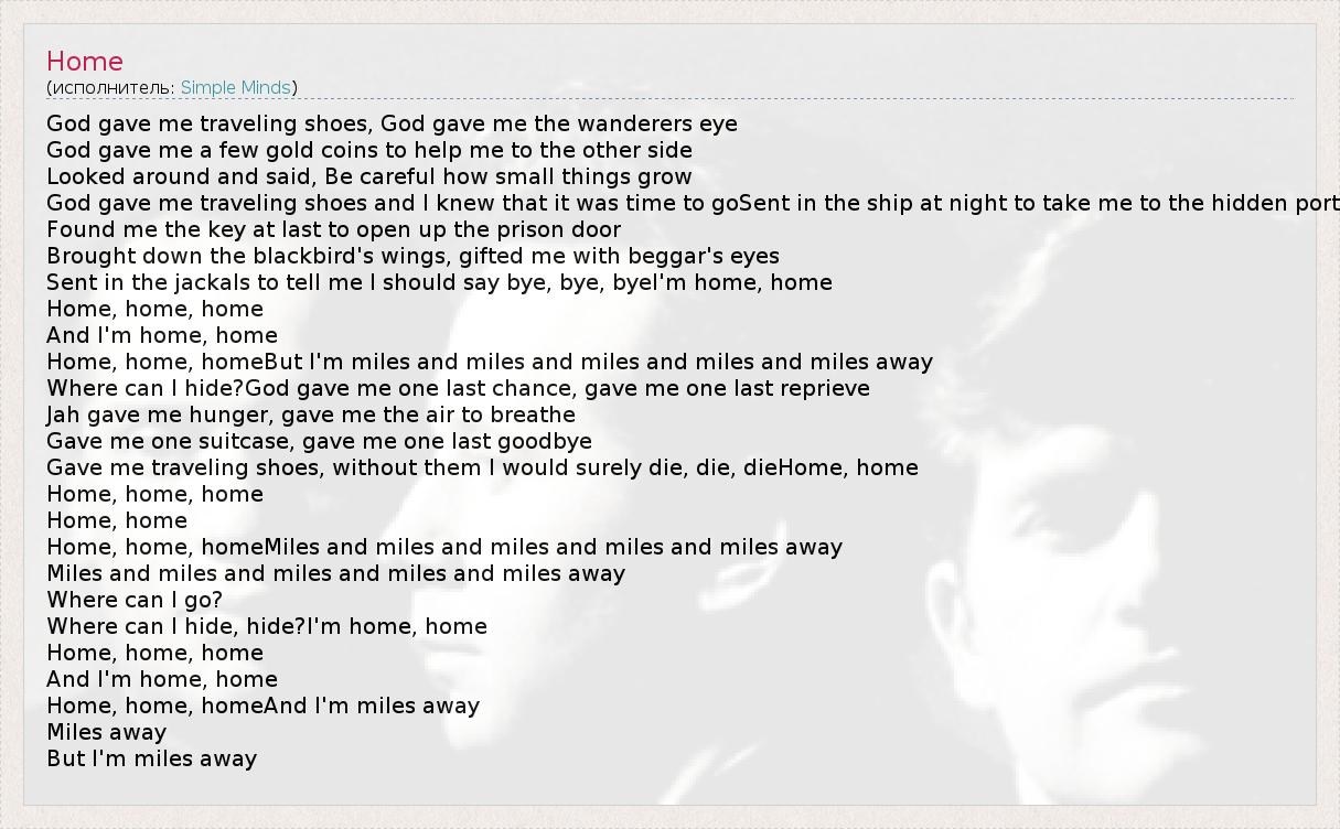 God gave me traveling shoes, God gave me the wanderers eye God gave me a few gold coins to help me to the other side Looked around and said, Be careful how small things grow God gave me traveling shoes and I knew that it was time to goSent in the ship at night to take me to the hidden port Found me the key at last to open up the prison door Brought down the blackbird's wings, gifted me with beggar's eyes Sent in the jackals to tell me I should say bye, bye, byeI'm home, home Home, home, home And I'm home, home Home, home, homeBut I'm miles and miles and miles and miles and miles away Where can I hide?God gave me one last chance, gave me one last reprieve Jah gave me hunger, gave me the air to breathe Gave me one suitcase, gave me one last goodbye Gave me traveling shoes, without them I would surely die, die, dieHome, home Home, home, home Home, home Home, home, homeMiles and miles and miles and miles and miles away Miles and miles and miles and miles and miles away Where can I go? Where can I hide, hide?I'm home, home Home, home, home And I'm home, home Home, home, homeAnd I'm miles away Miles away But I'm miles away