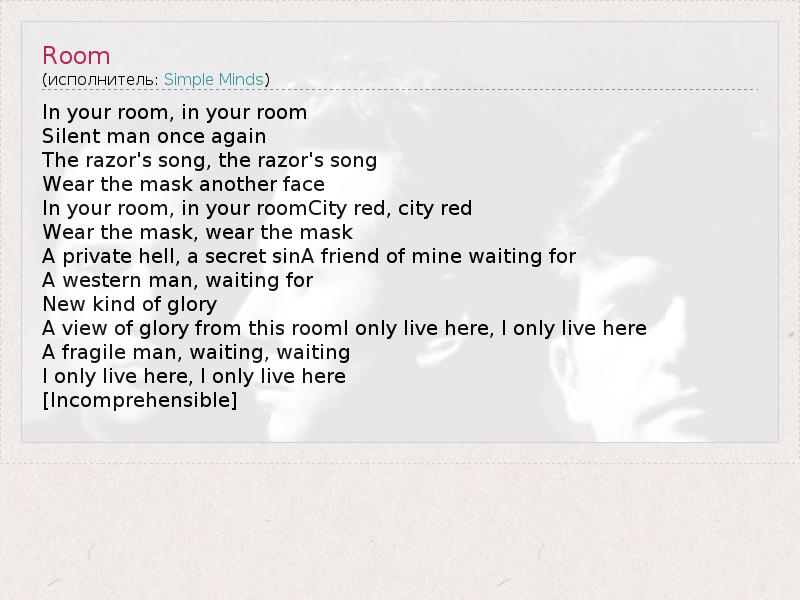 In your room, in your room Silent man once again The razor's song, the razor's song Wear the mask another face In your room, in your roomCity red, city red Wear the mask, wear the mask A private hell, a secret sinA friend of mine waiting for A western man, waiting for New kind of glory A view of glory from this roomI only live here, I only live here A fragile man, waiting, waiting I only live here, I only live here [Incomprehensible]