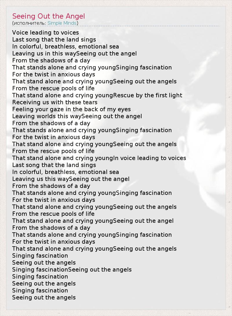 Voice leading to voices Last song that the land sings In colorful, breathless, emotional sea Leaving us in this waySeeing out the angel From the shadows of a day That stands alone and crying youngSinging fascination For the twist in anxious days That stand alone and crying youngSeeing out the angels From the rescue pools of life That stand alone and crying youngRescue by the first light Receiving us with these tears Feeling your gaze in the back of my eyes Leaving worlds this waySeeing out the angel From the shadows of a day That stands alone and crying youngSinging fascination For the twist in anxious days That stand alone and crying youngSeeing out the angels From the rescue pools of life That stand alone and crying youngIn voice leading to voices Last song that the land sings In colorful, breathless, emotional sea Leaving us this waySeeing out the angel From the shadows of a day That stands alone and crying youngSinging fascination For the twist in anxious days That stand alone and crying youngSeeing out the angels From the rescue pools of life That stand alone and crying youngSeeing out the angel From the shadows of a day That stands alone and crying youngSinging fascination For the twist in anxious days That stand alone and crying youngSeeing out the angels Singing fascination Seeing out the angels Singing fascinationSeeing out the angels Singing fascination Seeing out the angels Singing fascination Seeing out the angels