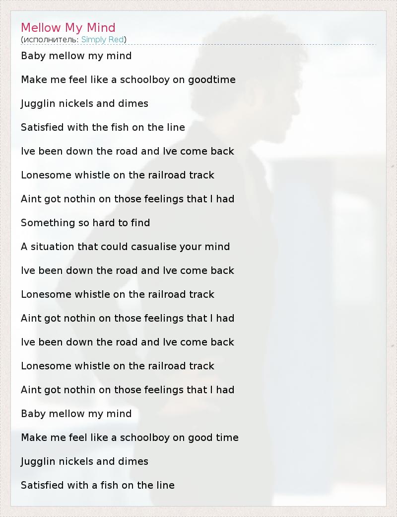 Baby mellow my mind Make me feel like a schoolboy on goodtime Jugglin nickels and dimes Satisfied with the fish on the line Ive been down the road and Ive come back Lonesome whistle on the railroad track Aint got nothin on those feelings that I had Something so hard to find A situation that could casualise your mind Ive been down the road and Ive come back Lonesome whistle on the railroad track Aint got nothin on those feelings that I had Ive been down the road and Ive come back Lonesome whistle on the railroad track Aint got nothin on those feelings that I had Baby mellow my mind Make me feel like a schoolboy on good time Jugglin nickels and dimes Satisfied with a fish on the line