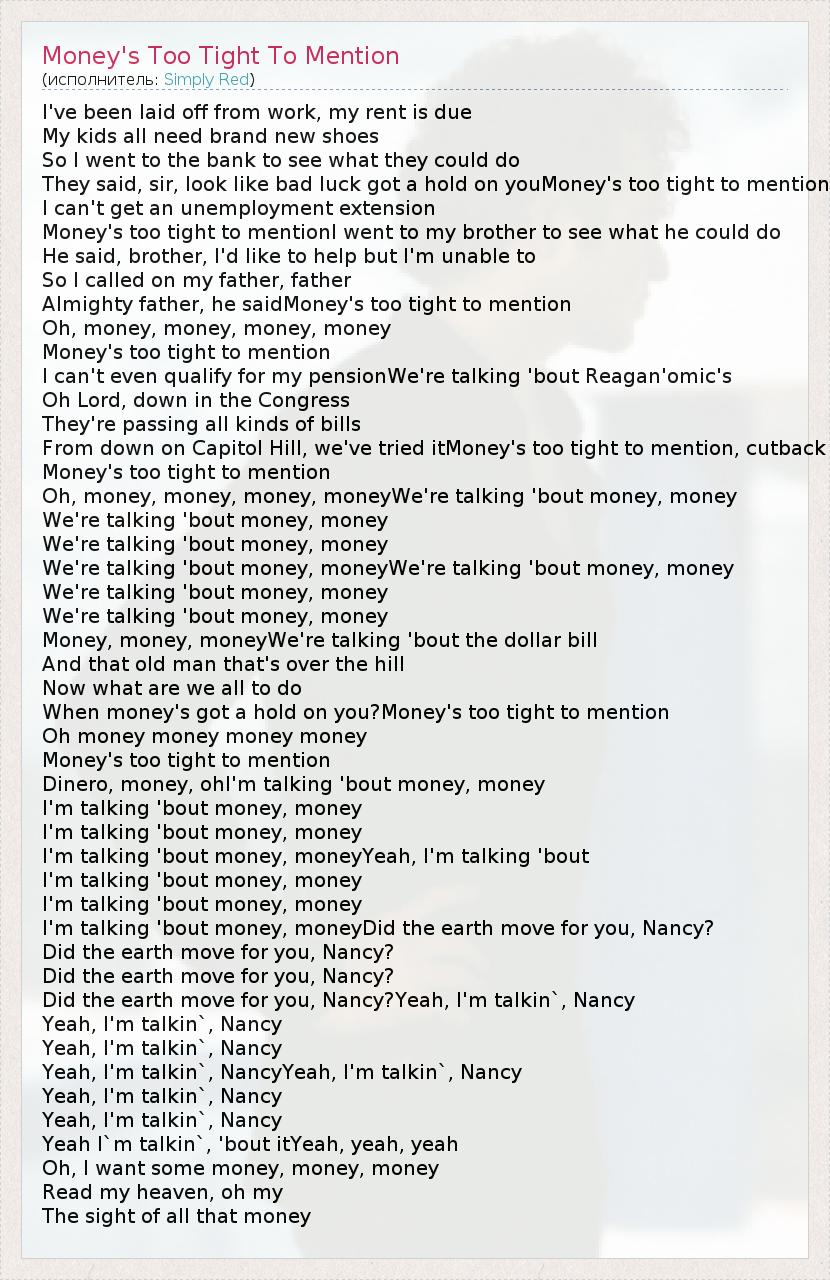 А как ты думаешь, о чем песня "Money's Too Tight To Mention" ?