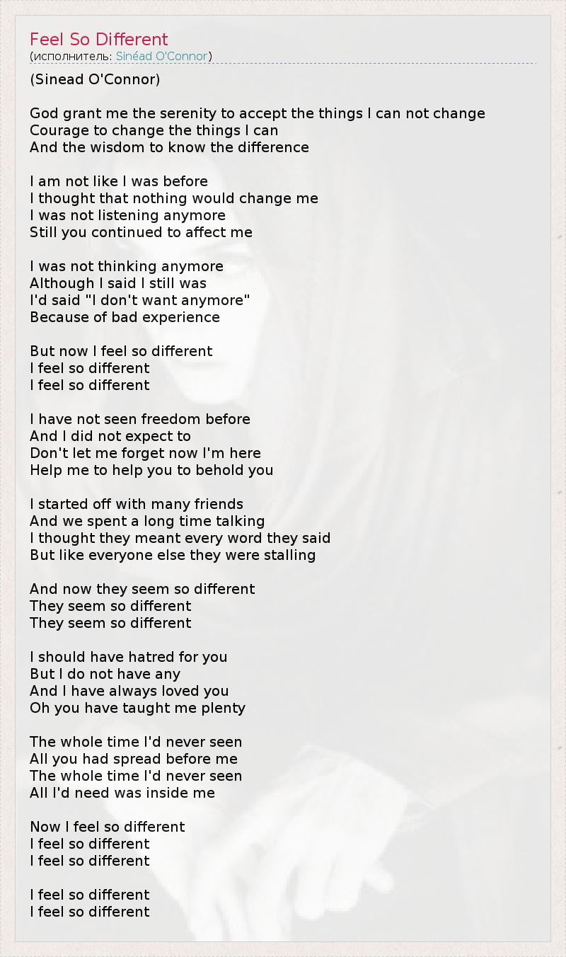 (Sinead O'Connor) God grant me the serenity to accept the things I can not change Courage to change the things I can And the wisdom to know the difference I am not like I was before I thought that nothing would change me I was not listening anymore Still you continued to affect me I was not thinking anymore Although I said I still was I'd said "I don't want anymore" Because of bad experience But now I feel so different I feel so different I feel so different I have not seen freedom before And I did not expect to Don't let me forget now I'm here Help me to help you to behold you I started off with many friends And we spent a long time talking I thought they meant every word they said But like everyone else they were stalling And now they seem so different They seem so different They seem so different I should have hatred for you But I do not have any And I have always loved you Oh you have taught me plenty The whole time I'd never seen All you had spread before me The whole time I'd never seen All I'd need was inside me Now I feel so different I feel so different I feel so different I feel so different I feel so different