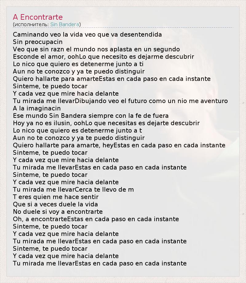 Caminando veo la vida veo que va desentendida Sin preocupacin Veo que sin razn el mundo nos aplasta en un segundo Esconde el amor, oohLo que necesito es dejarme descubrir Lo nico que quiero es detenerme junto a ti Aun no te conozco y ya te puedo distinguir Quiero hallarte para amarteEstas en cada paso en cada instante Sinteme, te puedo tocar Y cada vez que mire hacia delante Tu mirada me llevarDibujando veo el futuro como un nio me aventuro A la imaginacin Ese mundo Sin Bandera siempre con la fe de fuera Hoy ya no es ilusin, oohLo que necesitas es dejarte descubrir Lo nico que quiero es detenerme junto a t Aun no te conozco y ya te puedo distinguir Quiero hallarte para amarte, heyEstas en cada paso en cada instante Sinteme, te puedo tocar Y cada vez que mire hacia delante Tu mirada me llevarEstas en cada paso en cada instante Sinteme, te puedo tocar Y cada vez que mire hacia delante Tu mirada me llevarCerca te llevo de m T eres quien me hace sentir Que si a veces duele la vida No duele si voy a encontrarte Oh, a encontrarteEstas en cada paso en cada instante Sinteme, te puedo tocar Y cada vez que mire hacia delante Tu mirada me llevarEstas en cada paso en cada instante Sinteme, te puedo tocar Y cada vez que mire hacia delante Tu mirada me llevarEstas en cada paso en cada instante
