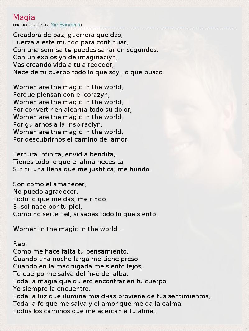 Creadora де Пас, Guerrera дие дас , FuerzaЭсте Mundo пункт continuar , Con Una Sonrisa tъ puedes SANAR ванной Segundos . Con ип explosiуn де imaginaciуn , Vas Creando Vidaту alrededor , Nace де ту Cuerpo TODO вот дие соевый вот дие Busco . Женщины являются магия в мире , Porque piensan кон -эль corazуn , Женщины являются магия в мире , Пор convertir ан alearнa TODO су Dolor , Женщины являются магия в мире , Пор guiarnos а-ля inspiraciуn . Женщины являются магия в мире , Пор descubrirnos El Camino дель амор . Ternura Infinita , Envidia Бендита , Tienes TODO вот дие El Alma Necesita , Грех ти луна Llena дие мне оправданием , меня hundo . Сын Комо эль Amanecer , Нет puedo agradecer , Todo вот дие мне дас , меня Rindo El Sol NACE POR ту Piel , Комо не serte Fiel , си sabes TODO вот дие Siento . Женщины в магии в мире ... Рэп : Комо меня HACE Falta Ту Pensamiento , Квандо уна Noche Ларга меня Tiene PRESO Квандо ан ла Madrugada меня Siento Lejos , Ту Cuerpo меня Сальва дель frнo дель Альба . Тода ла Магия дие Quiero encontrar ан ту Cuerpo Йо Siempre ла Encuentro . Тода ла Лус дие Ilumina неправильно dнas proviene де ЕП Sentimientos , Тода La Fe дие мне Сальва у El Amor дие мне да ла Кальма Тодос лос Каминос дие мне acercan в альма ТУ .