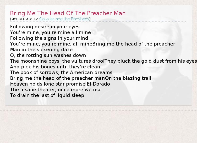 А как ты думаешь, о чем песня "Bring Me The Head Of The Preacher Man" ?