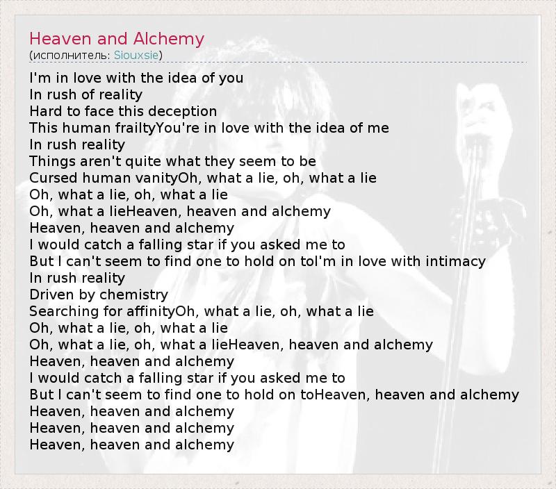 I'm in love with the idea of you In rush of reality Hard to face this deception This human frailtyYou're in love with the idea of me In rush reality Things aren't quite what they seem to be Cursed human vanityOh, what a lie, oh, what a lie Oh, what a lie, oh, what a lie Oh, what a lieHeaven, heaven and alchemy Heaven, heaven and alchemy I would catch a falling star if you asked me to But I can't seem to find one to hold on toI'm in love with intimacy In rush reality Driven by chemistry Searching for affinityOh, what a lie, oh, what a lie Oh, what a lie, oh, what a lie Oh, what a lie, oh, what a lieHeaven, heaven and alchemy Heaven, heaven and alchemy I would catch a falling star if you asked me to But I can't seem to find one to hold on toHeaven, heaven and alchemy Heaven, heaven and alchemy Heaven, heaven and alchemy Heaven, heaven and alchemy