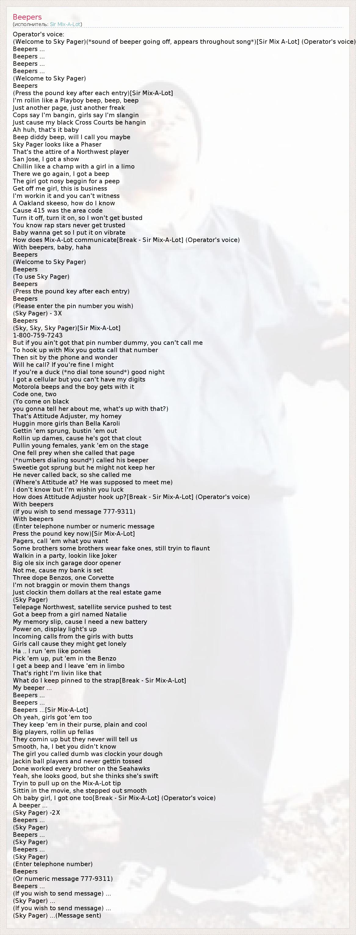 (Welcome to Sky Pager)(*sound of beeper going off, appears throughout song*)[Sir Mix A-Lot] (Operator's voice)