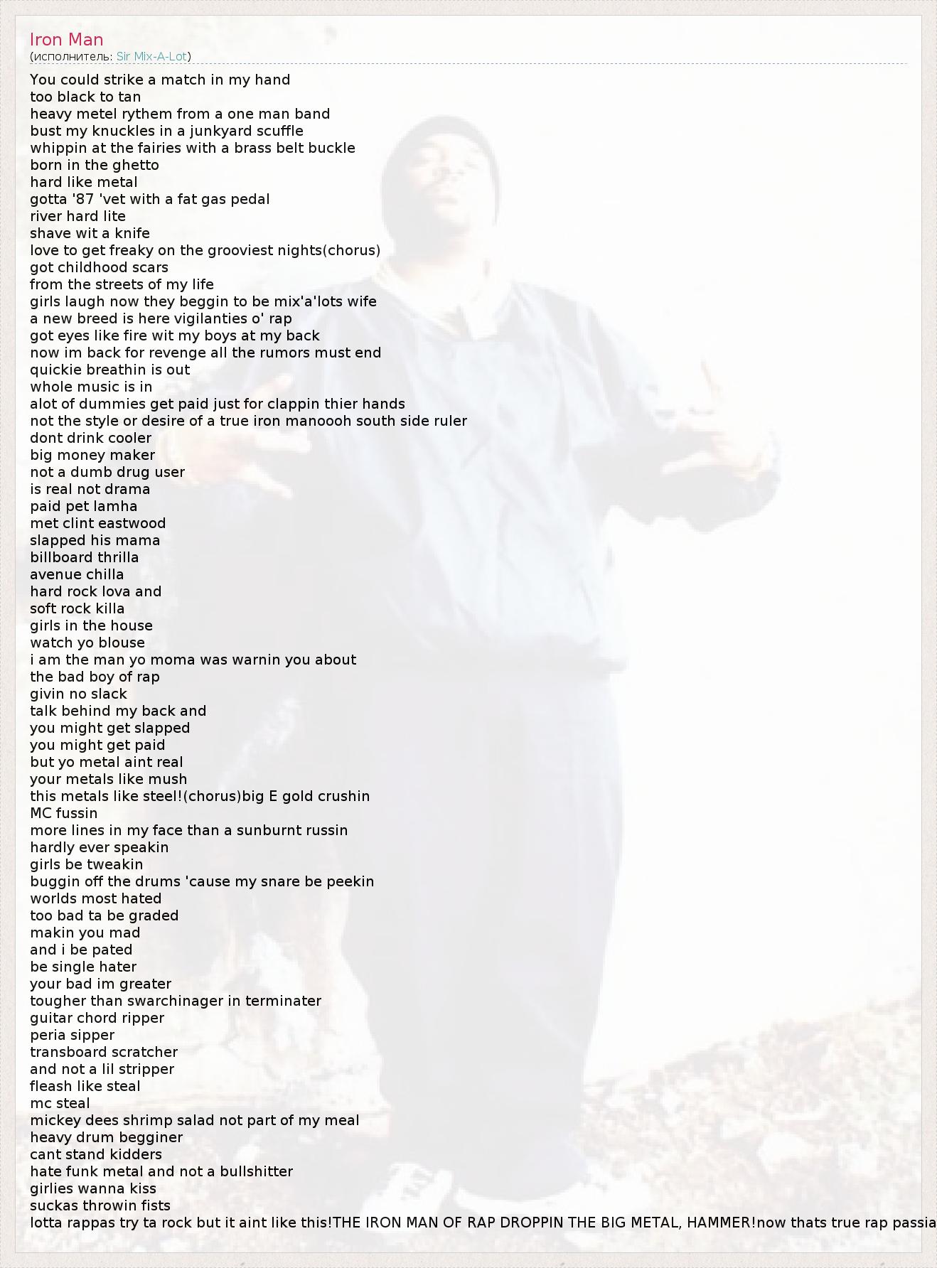 You could strike a match in my hand too black to tan heavy metel rythem from a one man band bust my knuckles in a junkyard scuffle whippin at the fairies with a brass belt buckle born in the ghetto hard like metal gotta '87 'vet with a fat gas pedal river hard lite shave wit a knife love to get freaky on the grooviest nights(chorus) got childhood scars from the streets of my life girls laugh now they beggin to be mix'a'lots wife a new breed is here vigilanties o' rap got eyes like fire wit my boys at my back now im back for revenge all the rumors must end quickie breathin is out whole music is in alot of dummies get paid just for clappin thier hands not the style or desire of a true iron manoooh south side ruler dont drink cooler big money maker not a dumb drug user is real not drama paid pet lamha met clint eastwood slapped his mama billboard thrilla avenue chilla hard rock lova and soft rock killa girls in the house watch yo blouse i am the man yo moma was warnin you about the bad boy of rap givin no slack talk behind my back and you might get slapped you might get paid but yo metal aint real your metals like mush this metals like steel!(chorus)big E gold crushin MC fussin more lines in my face than a sunburnt russin hardly ever speakin girls be tweakin buggin off the drums 'cause my snare be peekin worlds most hated too bad ta be graded makin you mad and i be pated be single hater your bad im greater tougher than swarchinager in terminater guitar chord ripper peria sipper transboard scratcher and not a lil stripper fleash like steal mc steal mickey dees shrimp salad not part of my meal heavy drum begginer cant stand kidders hate funk metal and not a bullshitter girlies wanna kiss suckas throwin fists lotta rappas try ta rock but it aint like this!THE IRON MAN OF RAP DROPPIN THE BIG METAL, HAMMER!now thats true rap passia