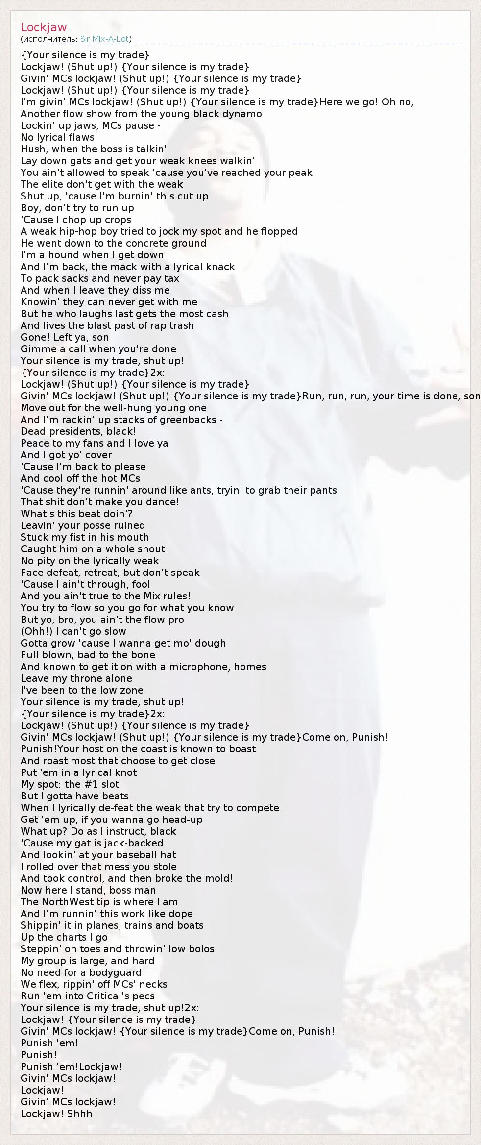 Givin' MCs lockjaw! (Shut up!) {Your silence is my trade}