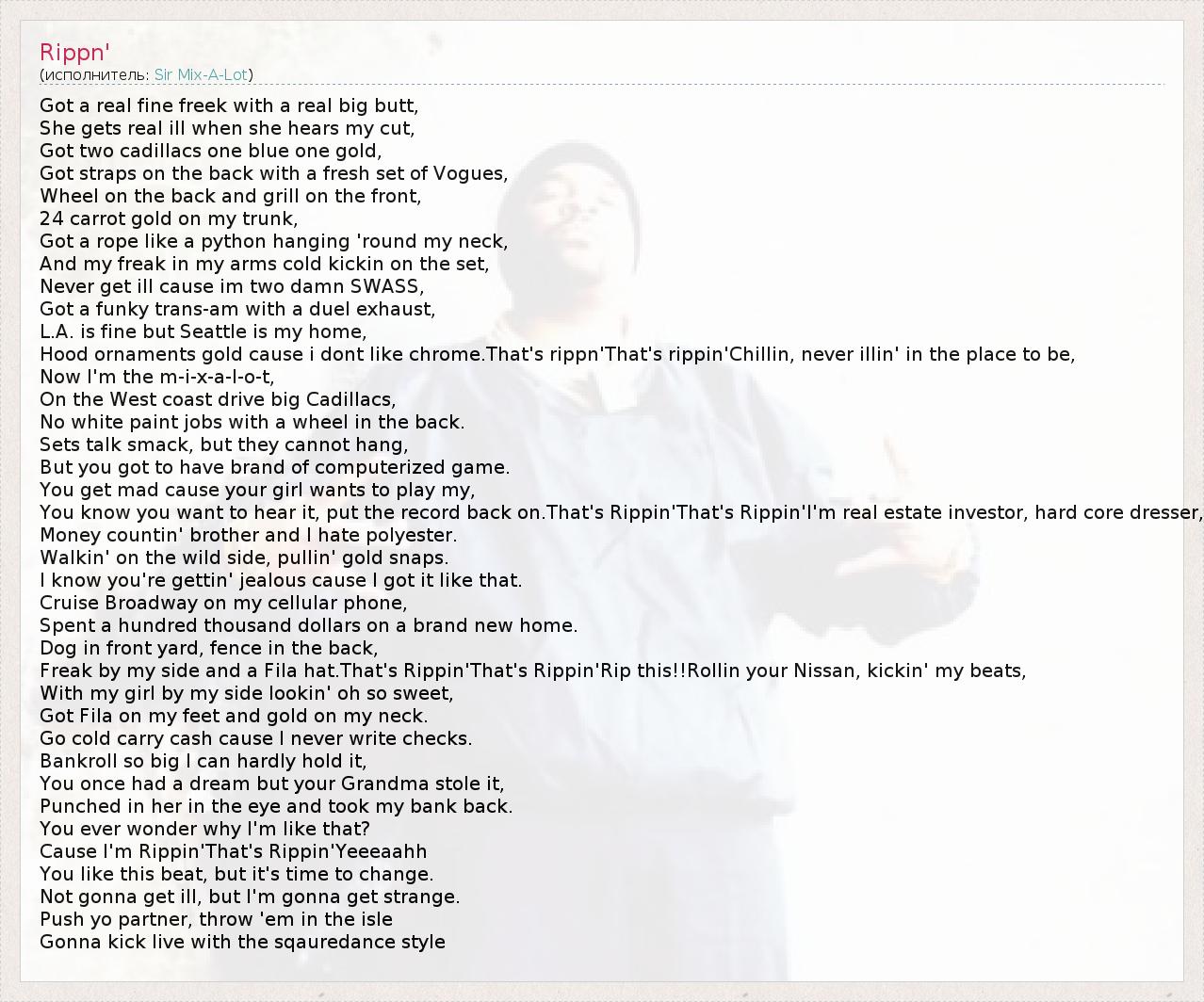 Freak by my side and a Fila hat.That's Rippin'That's Rippin'Rip this!!Rollin your Nissan, kickin' my beats,