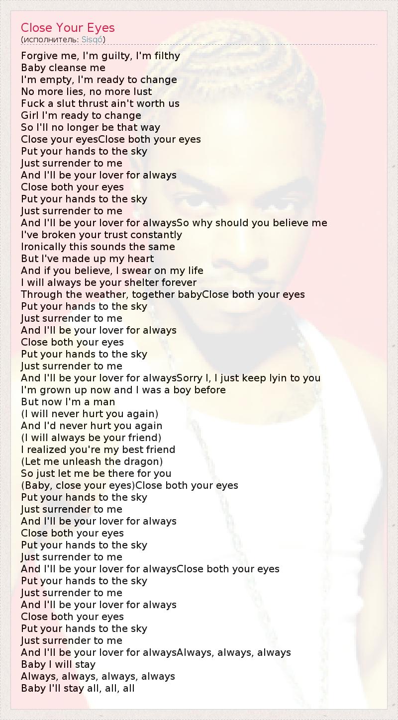 Forgive me, I'm guilty, I'm filthy Baby cleanse me I'm empty, I'm ready to change No more lies, no more lust Fuck a slut thrust ain't worth us Girl I'm ready to change So I'll no longer be that way Close your eyesClose both your eyes Put your hands to the sky Just surrender to me And I'll be your lover for always Close both your eyes Put your hands to the sky Just surrender to me And I'll be your lover for alwaysSo why should you believe me I've broken your trust constantly Ironically this sounds the same But I've made up my heart And if you believe, I swear on my life I will always be your shelter forever Through the weather, together babyClose both your eyes Put your hands to the sky Just surrender to me And I'll be your lover for always Close both your eyes Put your hands to the sky Just surrender to me And I'll be your lover for alwaysSorry I, I just keep lyin to you I'm grown up now and I was a boy before But now I'm a man (I will never hurt you again) And I'd never hurt you again (I will always be your friend) I realized you're my best friend (Let me unleash the dragon) So just let me be there for you (Baby, close your eyes)Close both your eyes Put your hands to the sky Just surrender to me And I'll be your lover for always Close both your eyes Put your hands to the sky Just surrender to me And I'll be your lover for alwaysClose both your eyes Put your hands to the sky Just surrender to me And I'll be your lover for always Close both your eyes Put your hands to the sky Just surrender to me And I'll be your lover for alwaysAlways, always, always Baby I will stay Always, always, always, always Baby I'll stay all, all, all