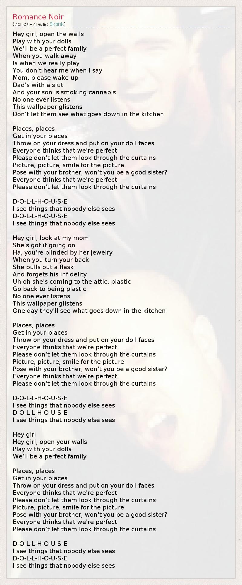 Эй, девочка, раздвинь стенки, Поиграй со своими куклами, Мы будем идеальной семьей. Когда ты уходишь, Тогда мы начинаем настоящую игру, Ты не слышишь меня, когда я говорю... Мама, прошу, проснись, Папа со шл*хой, А твой сынок курит марихуану. Никто никого не слушает. Эти обои блестят. Не позволяй никому увидеть то, что происходит на кухне... Места, места, Займите свои места, Натягивай платье и сделай кукольное личико, Все считают нас идеальными, Прошу, не позволяй им заглянуть за шторы. Фото, фото, улыбнись для фото, Попозируй с братом, разве ты не хорошая сестричка? Всем кажется, что мы идеальны, Прошу, только не позволяй им заглянуть за шторы... К-У-К-О-Л-Ь-Н-Ы-Й-Д-О-М-И-К, Я вижу то, чего больше никто не видит, К-У-К-О-Л-Ь-Н-Ы-Й-Д-О-М-И-К, Я вижу то, чего больше никто не видит... Эй, девочка, посмотри на мою маму, Она кажется шикарной, Ха, тебя ослепили ее драгоценности, Стоит тебе отвернуться, Как она вытаскивает фляжку, Чтобы забыть о его изменах. Ой-ой, она идет на чердак, ненастоящей, Она снова становится ненастоящей. Никто никого не слушает, Эти обои блестят. Однажды все увидят то, что происходит на кухне... Места, места, Займите свои места, Натягивай платье и сделай кукольное личико, Все считают нас идеальными, Прошу, не позволяй им заглянуть за шторы. Фото, фото, улыбнись для фото, Попозируй с братом, разве ты не хорошая сестричка? Всем кажется, что мы идеальны, Прошу, только не позволяй им заглянуть за шторы... К-У-К-О-Л-Ь-Н-Ы-Й-Д-О-М-И-К, Я вижу то, чего больше никто не видит, К-У-К-О-Л-Ь-Н-Ы-Й-Д-О-М-И-К, Я вижу то, чего больше никто не видит... Эй, девочка, Эй, девочка, раздвинь стенки, Поиграй со своими куклами, Мы будем идеальной семьей... Места, места, Займите свои места, Натягивай платье и сделай кукольное личико, Все считают нас идеальными, Прошу, не позволяй им заглянуть за шторы. Фото, фото, улыбнись для фото, Попозируй с братом, разве ты не хорошая сестричка? Всем кажется, что мы идеальны, Прошу, только не позволяй им заглянуть за шторы... К-У-К-О-Л-Ь-Н-Ы-Й-Д-О-М-И-К, Я вижу то, чего больше никто не видит, К-У-К-О-Л-Ь-Н-Ы-Й-Д-О-М-И-К, Я вижу то, чего больше никто не видит...