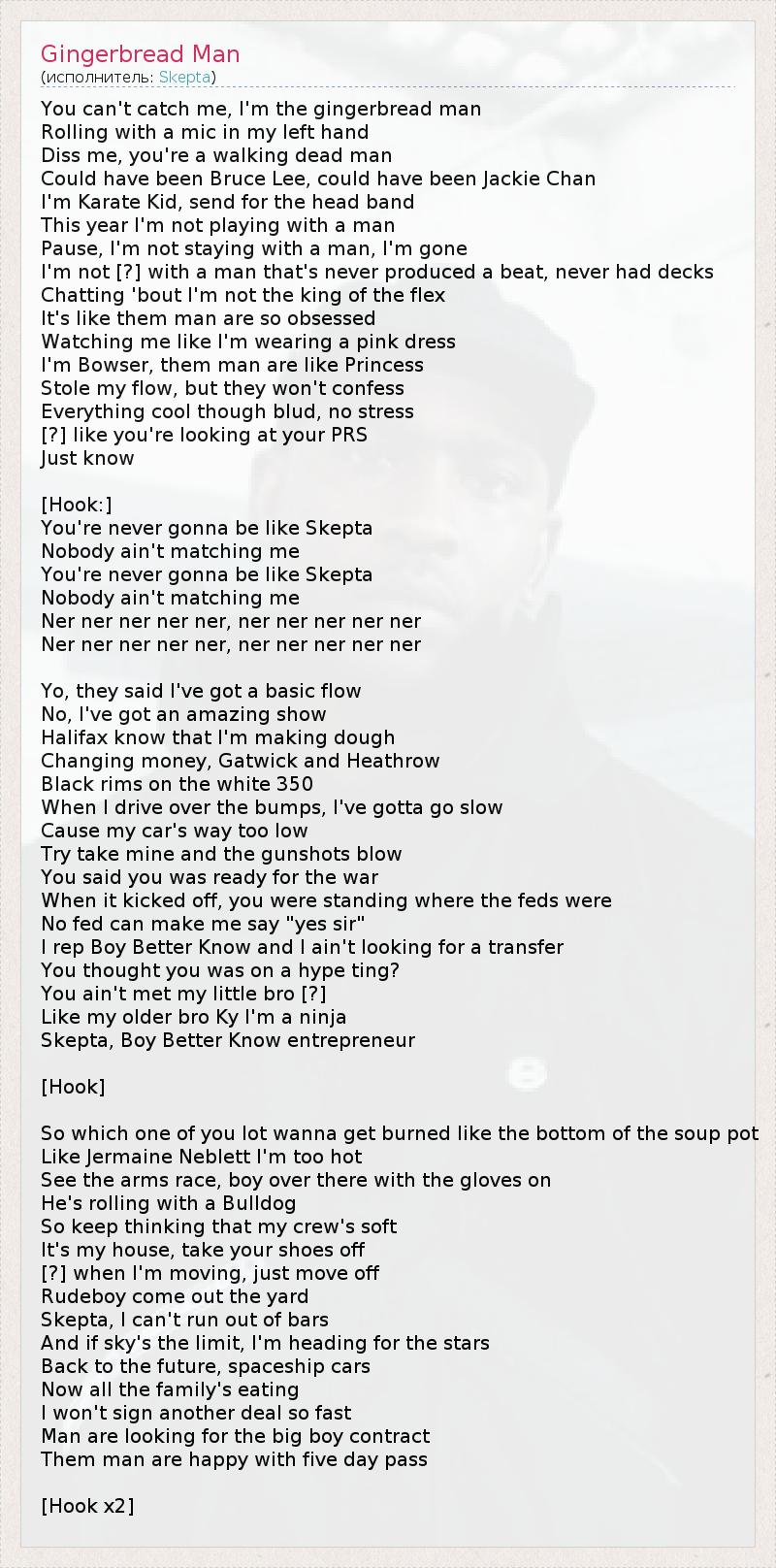 You can't catch me, I'm the gingerbread man Rolling with a mic in my left hand Diss me, you're a walking dead man Could have been Bruce Lee, could have been Jackie Chan I'm Karate Kid, send for the head band This year I'm not playing with a man Pause, I'm not staying with a man, I'm gone I'm not [?] with a man that's never produced a beat, never had decks Chatting 'bout I'm not the king of the flex It's like them man are so obsessed Watching me like I'm wearing a pink dress I'm Bowser, them man are like Princess Stole my flow, but they won't confess Everything cool though blud, no stress [?] like you're looking at your PRS Just know [Hook:] You're never gonna be like Skepta Nobody ain't matching me You're never gonna be like Skepta Nobody ain't matching me Ner ner ner ner ner, ner ner ner ner ner Ner ner ner ner ner, ner ner ner ner ner Yo, they said I've got a basic flow No, I've got an amazing show Halifax know that I'm making dough Changing money, Gatwick and Heathrow Black rims on the white 350 When I drive over the bumps, I've gotta go slow Cause my car's way too low Try take mine and the gunshots blow You said you was ready for the war When it kicked off, you were standing where the feds were No fed can make me say "yes sir" I rep Boy Better Know and I ain't looking for a transfer You thought you was on a hype ting? You ain't met my little bro [?] Like my older bro Ky I'm a ninja Skepta, Boy Better Know entrepreneur [Hook] So which one of you lot wanna get burned like the bottom of the soup pot Like Jermaine Neblett I'm too hot See the arms race, boy over there with the gloves on He's rolling with a Bulldog So keep thinking that my crew's soft It's my house, take your shoes off [?] when I'm moving, just move off Rudeboy come out the yard Skepta, I can't run out of bars And if sky's the limit, I'm heading for the stars Back to the future, spaceship cars Now all the family's eating I won't sign another deal so fast Man are looking for the big boy contract Them man are happy with five day pass [Hook x2]