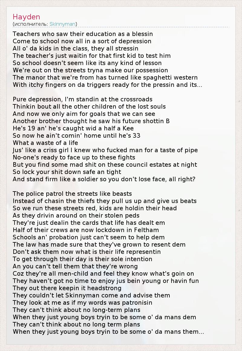 Это интересно:Skinnyman (настоящее имя - Алекс Холлэнд (Alex Holland) - британский рэппер, родидся в 1974 г. в Лидсе, в юном возрасте переехал в Лондон. Вместе с Mongo и Chester P (сейчас Task Force) сформировал Mud Family, выпустив несколько мини-пластинок, включающих в себя "Itchy Town" и "Lash Suttin", a также версию песни Redman "Smash Something". Дебютный альбом "Council Estate of Mind" Skinnyman выпустил в 2004 г.Skinnyman участвовал в записях различных... продолжение