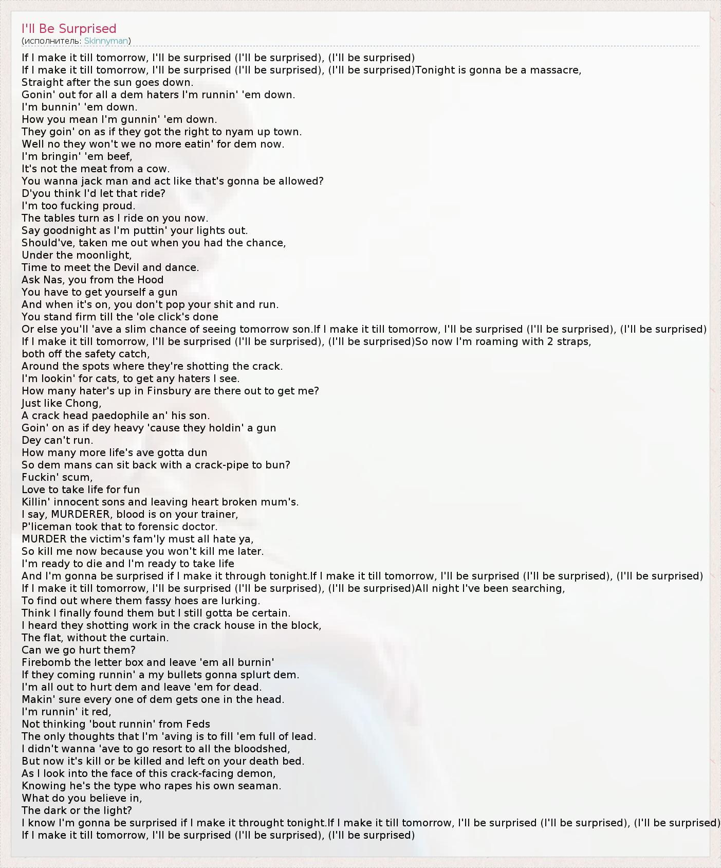 Or else you'll 'ave a slim chance of seeing tomorrow son.If I make it till tomorrow, I'll be surprised (I'll be surprised), (I'll be surprised)