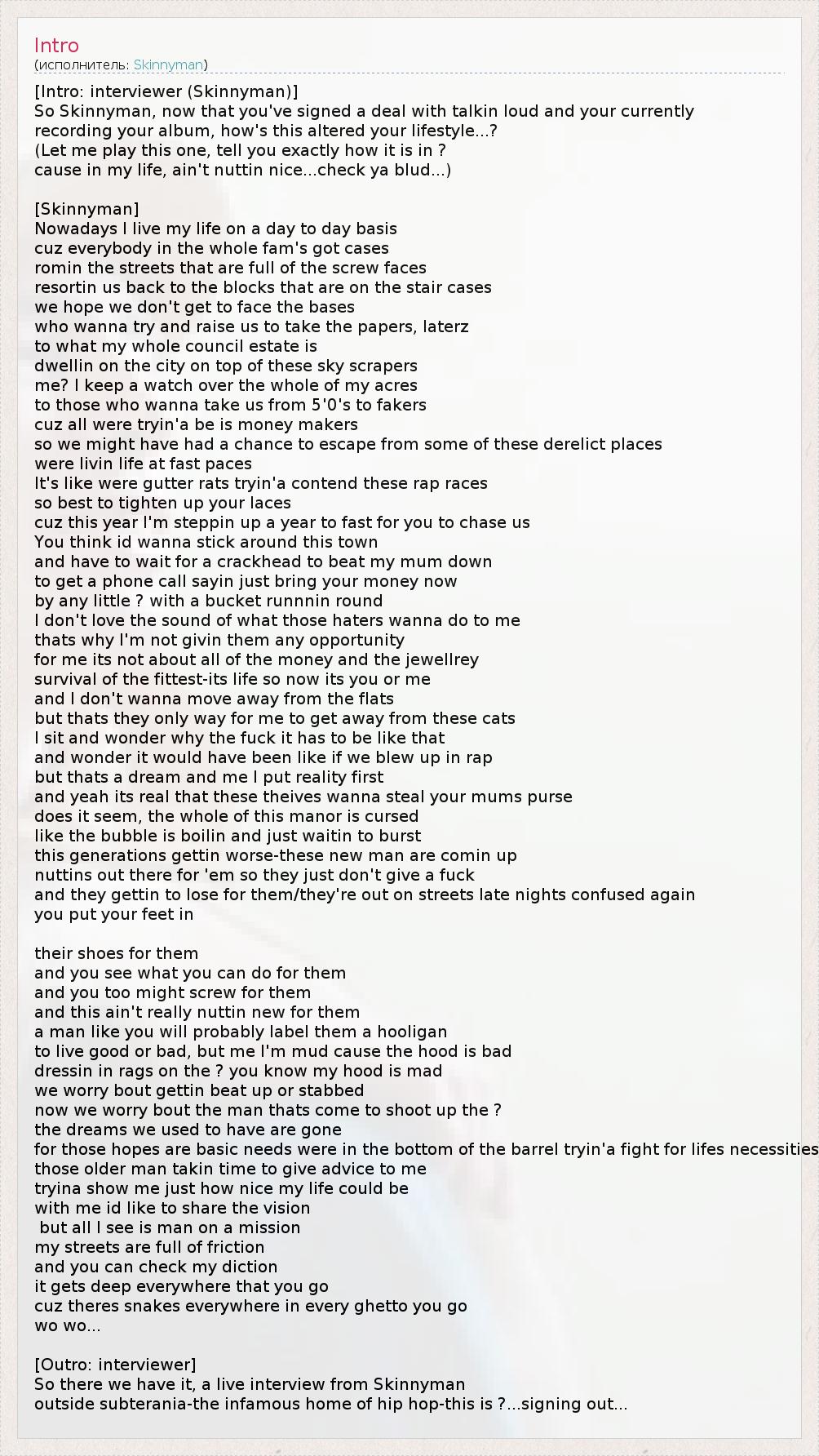 [Intro: interviewer (Skinnyman)] So Skinnyman, now that you've signed a deal with talkin loud and your currently recording your album, how's this altered your lifestyle...? (Let me play this one, tell you exactly how it is in ? cause in my life, ain't nuttin nice...check ya blud...) [Skinnyman] Nowadays I live my life on a day to day basis cuz everybody in the whole fam's got cases romin the streets that are full of the screw faces resortin us back to the blocks that are on the stair cases we hope we don't get to face the bases who wanna try and raise us to take the papers, laterz to what my whole council estate is dwellin on the city on top of these sky scrapers me? I keep a watch over the whole of my acres to those who wanna take us from 5'0's to fakers cuz all were tryin'a be is money makers so we might have had a chance to escape from some of these derelict places were livin life at fast paces It's like were gutter rats tryin'a contend these rap races so best to tighten up your laces cuz this year I'm steppin up a year to fast for you to chase us You think id wanna stick around this town and have to wait for a crackhead to beat my mum down to get a phone call sayin just bring your money now by any little ? with a bucket runnnin round I don't love the sound of what those haters wanna do to me thats why I'm not givin them any opportunity for me its not about all of the money and the jewellrey survival of the fittest-its life so now its you or me and I don't wanna move away from the flats but thats they only way for me to get away from these cats I sit and wonder why the fuck it has to be like that and wonder it would have been like if we blew up in rap but thats a dream and me I put reality first and yeah its real that these theives wanna steal your mums purse does it seem, the whole of this manor is cursed like the bubble is boilin and just waitin to burst this generations gettin worse-these new man are comin up nuttins out there for 'em so they just don't give a fuck and they gettin to lose for them/they're out on streets late nights confused again you put your feet in their shoes for them and you see what you can do for them and you too might screw for them and this ain't really nuttin new for them a man like you will probably label them a hooligan to live good or bad, but me I'm mud cause the hood is bad dressin in rags on the ? you know my hood is mad we worry bout gettin beat up or stabbed now we worry bout the man thats come to shoot up the ? the dreams we used to have are gone for those hopes are basic needs were in the bottom of the barrel tryin'a fight for lifes necessities those older man takin time to give advice to me tryina show me just how nice my life could be with me id like to share the vision but all I see is man on a mission my streets are full of friction and you can check my diction it gets deep everywhere that you go cuz theres snakes everywhere in every ghetto you go wo wo... [Outro: interviewer] So there we have it, a live interview from Skinnyman outside subterania-the infamous home of hip hop-this is ?...signing out...