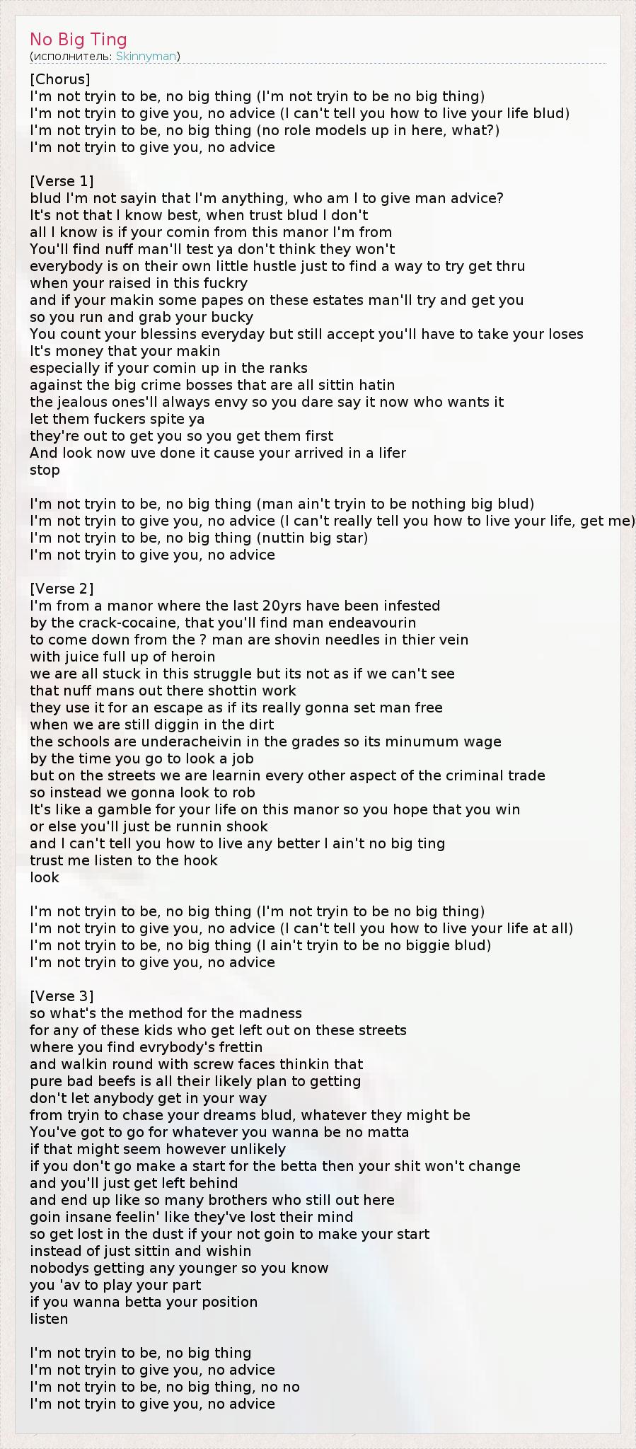 [Chorus] I'm not tryin to be, no big thing (I'm not tryin to be no big thing) I'm not tryin to give you, no advice (I can't tell you how to live your life blud) I'm not tryin to be, no big thing (no role models up in here, what?) I'm not tryin to give you, no advice [Verse 1] blud I'm not sayin that I'm anything, who am I to give man advice? It's not that I know best, when trust blud I don't all I know is if your comin from this manor I'm from You'll find nuff man'll test ya don't think they won't everybody is on their own little hustle just to find a way to try get thru when your raised in this fuckry and if your makin some papes on these estates man'll try and get you so you run and grab your bucky You count your blessins everyday but still accept you'll have to take your loses It's money that your makin especially if your comin up in the ranks against the big crime bosses that are all sittin hatin the jealous ones'll always envy so you dare say it now who wants it let them fuckers spite ya they're out to get you so you get them first And look now uve done it cause your arrived in a lifer stop I'm not tryin to be, no big thing (man ain't tryin to be nothing big blud) I'm not tryin to give you, no advice (I can't really tell you how to live your life, get me) I'm not tryin to be, no big thing (nuttin big star) I'm not tryin to give you, no advice [Verse 2] I'm from a manor where the last 20yrs have been infested by the crack-cocaine, that you'll find man endeavourin to come down from the ? man are shovin needles in thier vein with juice full up of heroin we are all stuck in this struggle but its not as if we can't see that nuff mans out there shottin work they use it for an escape as if its really gonna set man free when we are still diggin in the dirt the schools are underacheivin in the grades so its minumum wage by the time you go to look a job but on the streets we are learnin every other aspect of the criminal trade so instead we gonna look to rob It's like a gamble for your life on this manor so you hope that you win or else you'll just be runnin shook and I can't tell you how to live any better I ain't no big ting trust me listen to the hook look I'm not tryin to be, no big thing (I'm not tryin to be no big thing) I'm not tryin to give you, no advice (I can't tell you how to live your life at all) I'm not tryin to be, no big thing (I ain't tryin to be no biggie blud) I'm not tryin to give you, no advice [Verse 3] so what's the method for the madness for any of these kids who get left out on these streets where you find evrybody's frettin and walkin round with screw faces thinkin that pure bad beefs is all their likely plan to getting don't let anybody get in your way from tryin to chase your dreams blud, whatever they might be You've got to go for whatever you wanna be no matta if that might seem however unlikely if you don't go make a start for the betta then your shit won't change and you'll just get left behind and end up like so many brothers who still out here goin insane feelin' like they've lost their mind so get lost in the dust if your not goin to make your start instead of just sittin and wishin nobodys getting any younger so you know you 'av to play your part if you wanna betta your position listen I'm not tryin to be, no big thing I'm not tryin to give you, no advice I'm not tryin to be, no big thing, no no I'm not tryin to give you, no advice
