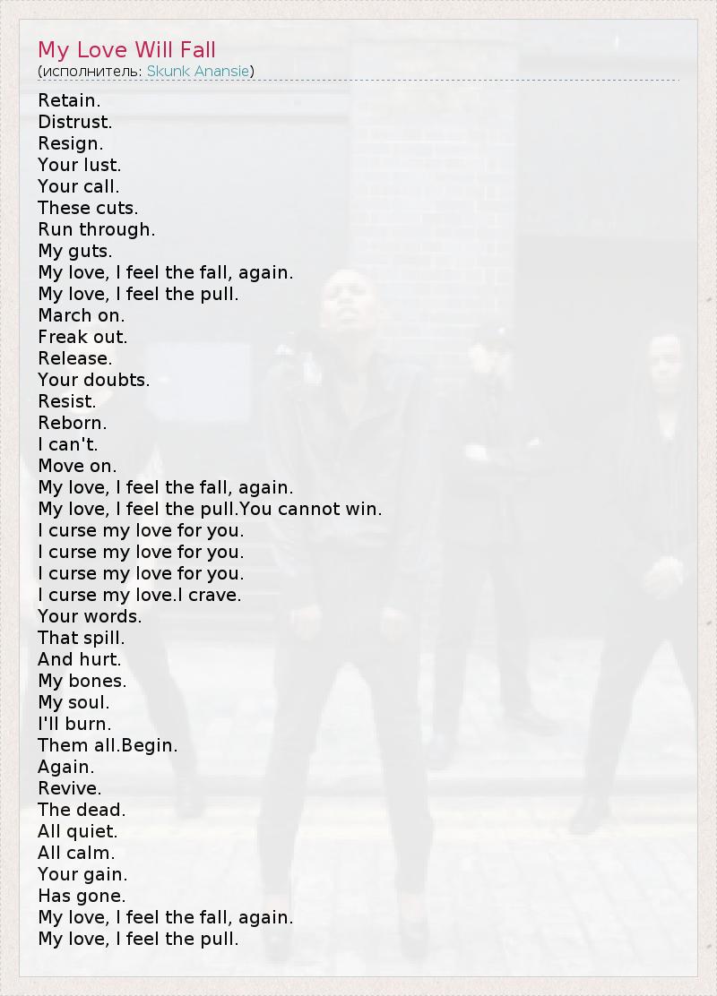 Retain. Distrust. Resign. Your lust. Your call. These cuts. Run through. My guts. My love, I feel the fall, again. My love, I feel the pull. March on. Freak out. Release. Your doubts. Resist. Reborn. I can't. Move on. My love, I feel the fall, again. My love, I feel the pull.You cannot win. I curse my love for you. I curse my love for you. I curse my love for you. I curse my love.I crave. Your words. That spill. And hurt. My bones. My soul. I'll burn. Them all.Begin. Again. Revive. The dead. All quiet. All calm. Your gain. Has gone. My love, I feel the fall, again. My love, I feel the pull.