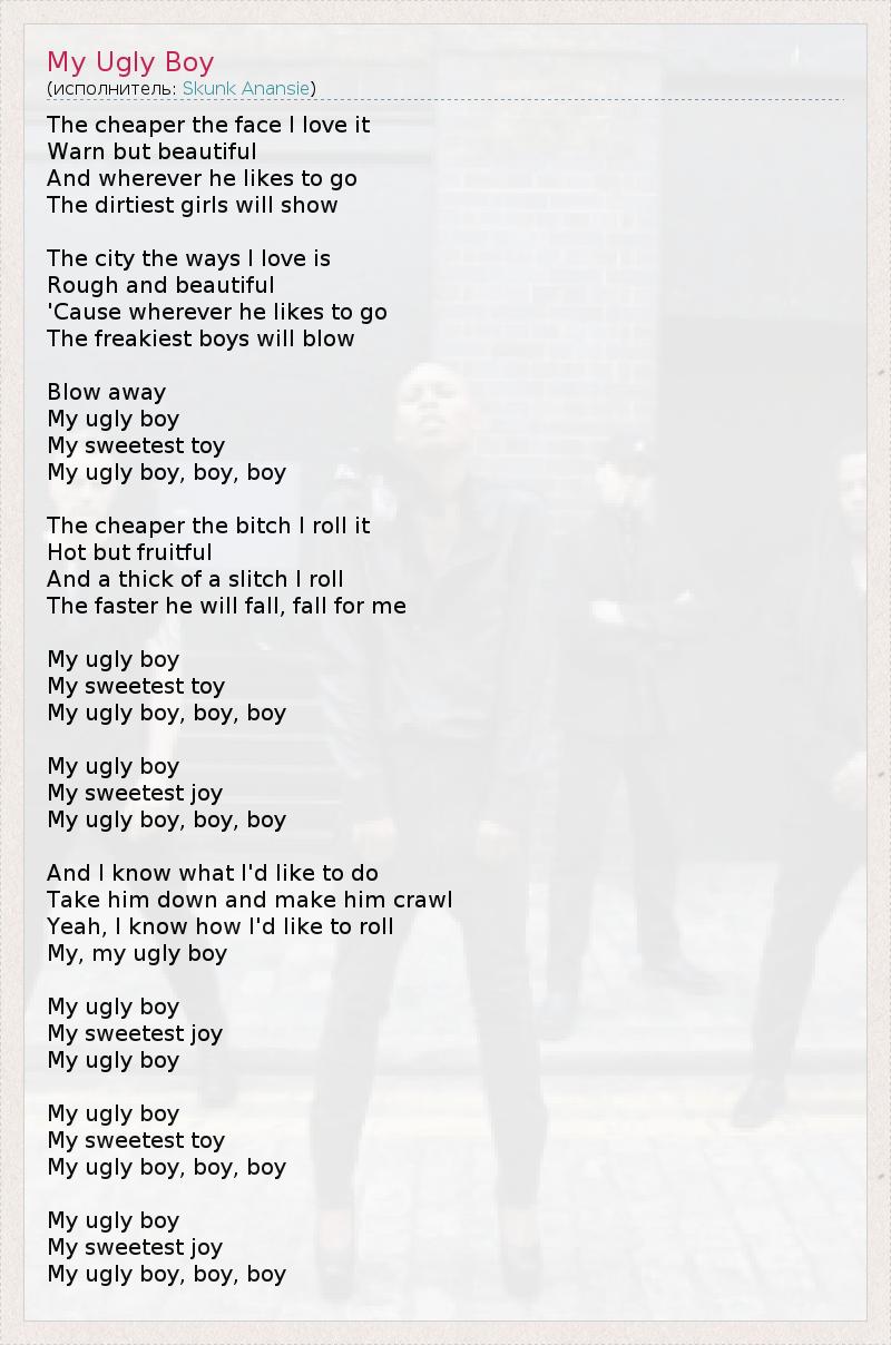 The cheaper the face I love it Warn but beautiful And wherever he likes to go The dirtiest girls will show The city the ways I love is Rough and beautiful 'Cause wherever he likes to go The freakiest boys will blow Blow away My ugly boy My sweetest toy My ugly boy, boy, boy The cheaper the bitch I roll it Hot but fruitful And a thick of a slitch I roll The faster he will fall, fall for me My ugly boy My sweetest toy My ugly boy, boy, boy My ugly boy My sweetest joy My ugly boy, boy, boy And I know what I'd like to do Take him down and make him crawl Yeah, I know how I'd like to roll My, my ugly boy My ugly boy My sweetest joy My ugly boy My ugly boy My sweetest toy My ugly boy, boy, boy My ugly boy My sweetest joy My ugly boy, boy, boy