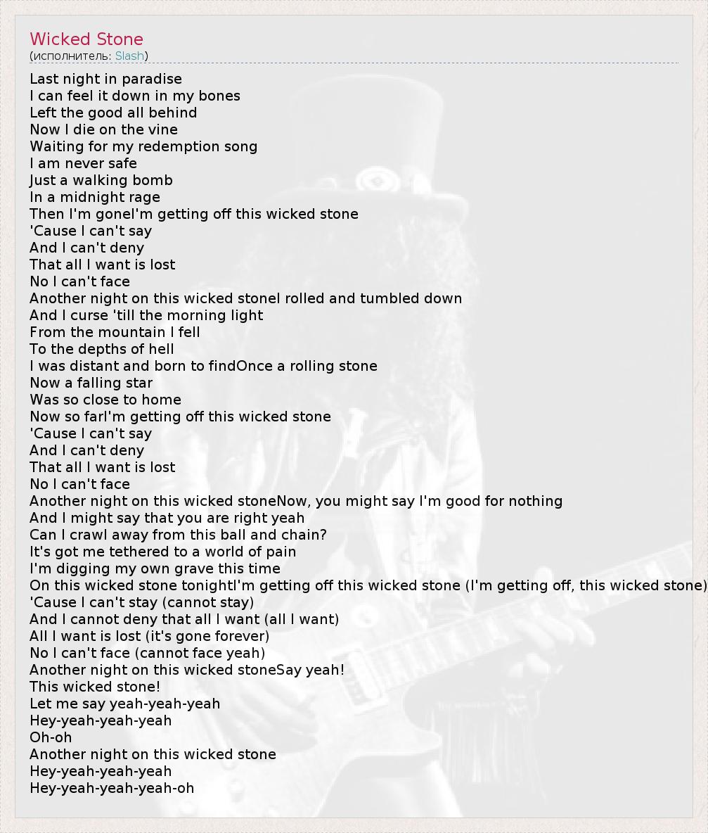 Last night in paradise I can feel it down in my bones Left the good all behind Now I die on the vine Waiting for my redemption song I am never safe Just a walking bomb In a midnight rage Then I'm goneI'm getting off this wicked stone 'Cause I can't say And I can't deny That all I want is lost No I can't face Another night on this wicked stoneI rolled and tumbled down And I curse 'till the morning light From the mountain I fell To the depths of hell I was distant and born to findOnce a rolling stone Now a falling star Was so close to home Now so farI'm getting off this wicked stone 'Cause I can't say And I can't deny That all I want is lost No I can't face Another night on this wicked stoneNow, you might say I'm good for nothing And I might say that you are right yeah Can I crawl away from this ball and chain? It's got me tethered to a world of pain I'm digging my own grave this time On this wicked stone tonightI'm getting off this wicked stone (I'm getting off, this wicked stone) 'Cause I can't stay (cannot stay) And I cannot deny that all I want (all I want) All I want is lost (it's gone forever) No I can't face (cannot face yeah) Another night on this wicked stoneSay yeah! This wicked stone! Let me say yeah-yeah-yeah Hey-yeah-yeah-yeah Oh-oh Another night on this wicked stone Hey-yeah-yeah-yeah Hey-yeah-yeah-yeah-oh