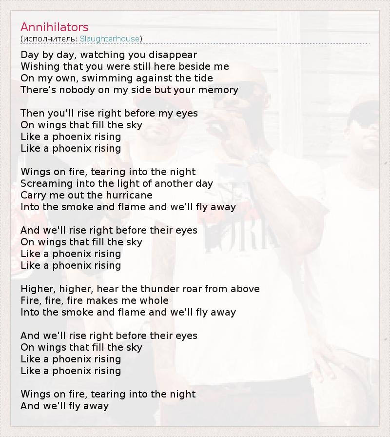 День за днем я смотрю, как ты исчезаешь, И желаю, чтобы ты по-прежнему была со мной. Наедине сам с собою плыву против течения, И на моей стороне нет никого кроме памяти о тебе... И затем на моих глазах ты поднимешься На крыльях, заполняющих собою небо, Как восстающий феникс... Как восстающий феникс... Крылья, рассекающие ночь, в огне, И они ярче, чем рассвет нового дня. Забери меня из этого урагана, И мы улетим прочь в дыме и пламени. Прямо на их глазах мы поднимемся На крыльях, заполняющих собою небо, Как восстающий феникс... Как восстающий феникс... Выше, выше... Слушай рев грома наверху. Огонь, огонь... Огонь исцелит меня, И мы улетим прочь в дыме и пламени. Прямо на их глазах мы поднимемся На крыльях, заполняющих собою небо, Как восстающий феникс... Как восстающий феникс... Крылья, рассекающие ночь, в огне, И мы улетим...