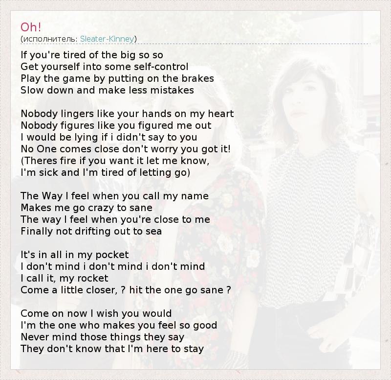 If you're tired of the big so so Get yourself into some self-control Play the game by putting on the brakes Slow down and make less mistakes Nobody lingers like your hands on my heart Nobody figures like you figured me out I would be lying if i didn't say to you No One comes close don't worry you got it! (Theres fire if you want it let me know, I'm sick and I'm tired of letting go) The Way I feel when you call my name Makes me go crazy to sane The way I feel when you're close to me Finally not drifting out to sea It's in all in my pocket I don't mind i don't mind i don't mind I call it, my rocket Come a little closer, ? hit the one go sane ? Come on now I wish you would I'm the one who makes you feel so good Never mind those things they say They don't know that I'm here to stay