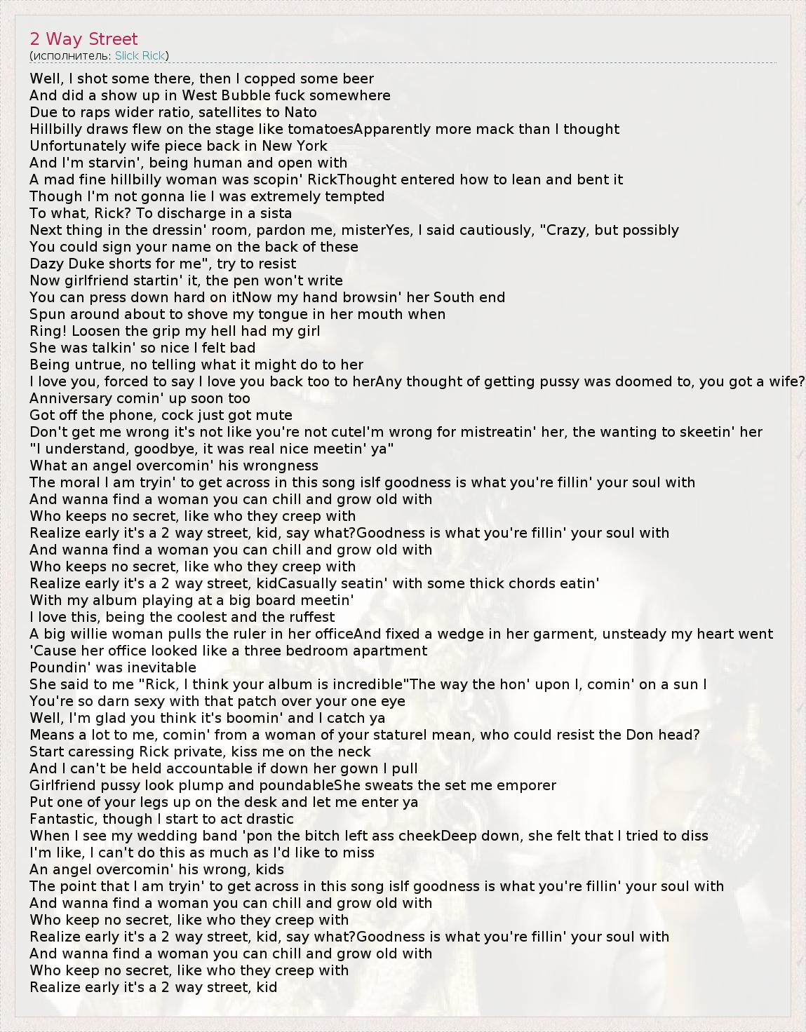 Well, I shot some there, then I copped some beer And did a show up in West Bubble fuck somewhere Due to raps wider ratio, satellites to Nato Hillbilly draws flew on the stage like tomatoesApparently more mack than I thought Unfortunately wife piece back in New York And I'm starvin', being human and open with A mad fine hillbilly woman was scopin' RickThought entered how to lean and bent it Though I'm not gonna lie I was extremely tempted To what, Rick? To discharge in a sista Next thing in the dressin' room, pardon me, misterYes, I said cautiously, "Crazy, but possibly You could sign your name on the back of these Dazy Duke shorts for me", try to resist Now girlfriend startin' it, the pen won't write You can press down hard on itNow my hand browsin' her South end Spun around about to shove my tongue in her mouth when Ring! Loosen the grip my hell had my girl She was talkin' so nice I felt bad Being untrue, no telling what it might do to her I love you, forced to say I love you back too to herAny thought of getting pussy was doomed to, you got a wife? Anniversary comin' up soon too Got off the phone, cock just got mute Don't get me wrong it's not like you're not cuteI'm wrong for mistreatin' her, the wanting to skeetin' her "I understand, goodbye, it was real nice meetin' ya" What an angel overcomin' his wrongness The moral I am tryin' to get across in this song isIf goodness is what you're fillin' your soul with And wanna find a woman you can chill and grow old with Who keeps no secret, like who they creep with Realize early it's a 2 way street, kid, say what?Goodness is what you're fillin' your soul with And wanna find a woman you can chill and grow old with Who keeps no secret, like who they creep with Realize early it's a 2 way street, kidCasually seatin' with some thick chords eatin' With my album playing at a big board meetin' I love this, being the coolest and the ruffest A big willie woman pulls the ruler in her officeAnd fixed a wedge in her garment, unsteady my heart went 'Cause her office looked like a three bedroom apartment Poundin' was inevitable She said to me "Rick, I think your album is incredible"The way the hon' upon I, comin' on a sun I You're so darn sexy with that patch over your one eye Well, I'm glad you think it's boomin' and I catch ya Means a lot to me, comin' from a woman of your statureI mean, who could resist the Don head? Start caressing Rick private, kiss me on the neck And I can't be held accountable if down her gown I pull Girlfriend pussy look plump and poundableShe sweats the set me emporer Put one of your legs up on the desk and let me enter ya Fantastic, though I start to act drastic When I see my wedding band 'pon the bitch left ass cheekDeep down, she felt that I tried to diss I'm like, I can't do this as much as I'd like to miss An angel overcomin' his wrong, kids The point that I am tryin' to get across in this song isIf goodness is what you're fillin' your soul with And wanna find a woman you can chill and grow old with Who keep no secret, like who they creep with Realize early it's a 2 way street, kid, say what?Goodness is what you're fillin' your soul with And wanna find a woman you can chill and grow old with Who keep no secret, like who they creep with Realize early it's a 2 way street, kid