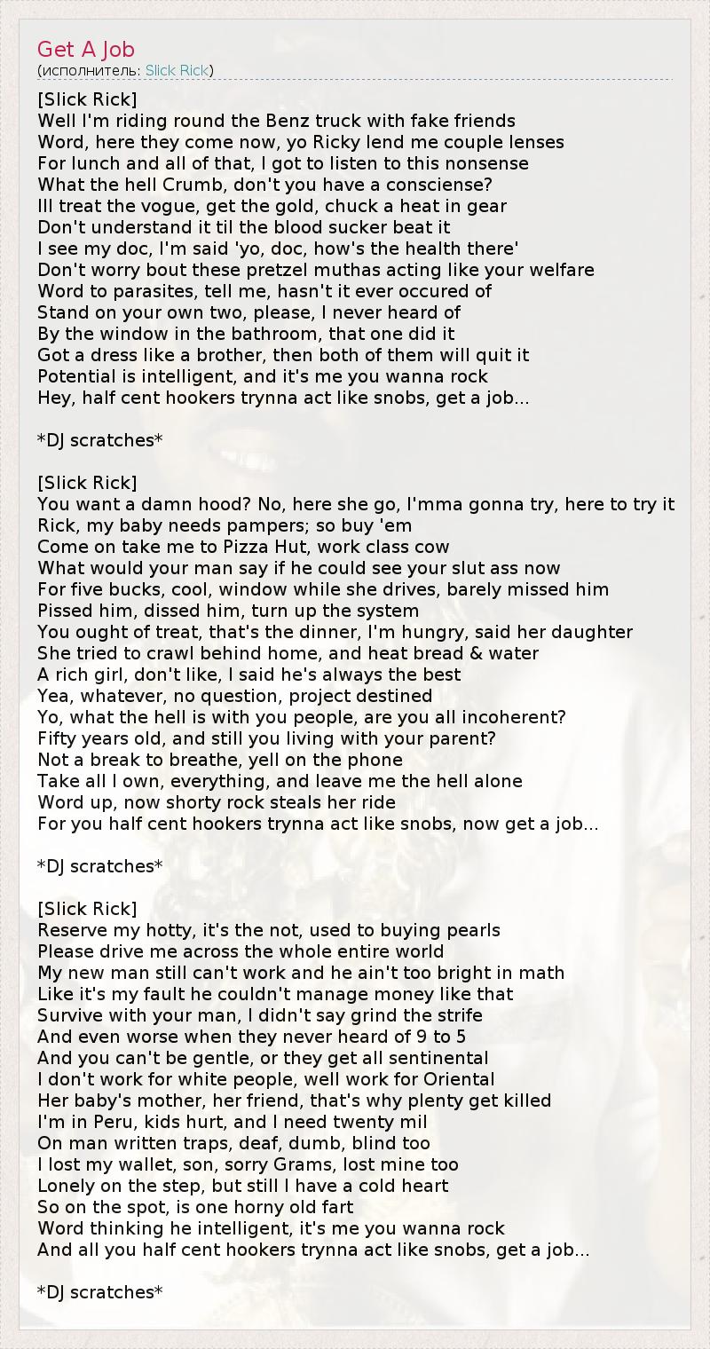Это интересно:Slick Rick (также известный под псевдонимами MC Ricky D и The Ruler) настоящие имя Richard Walters, родился 14-го января 1965-го года в Лондоне, но начал свою музыкальную карьеру в Америке. В 1975-м году, он с семьёй переехал в Бронкс, Нью-Йорк, где встретил человека по имени Prince Charmz, который, как говорит сам Slick Rick, научил его читать рэп. Известности он добился благодаря серии треков записанных в 80-ых годах, таких как... продолжение