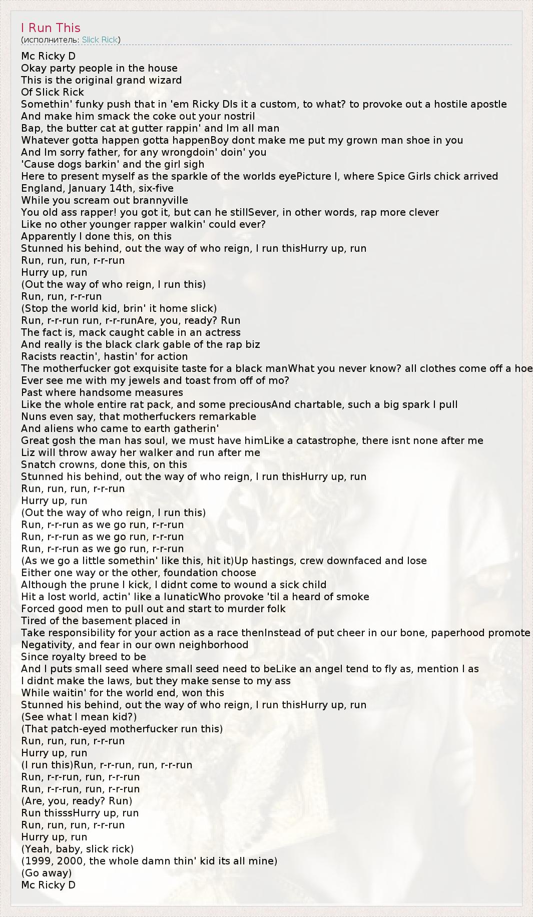 Это интересно:Slick Rick (также известный под псевдонимами MC Ricky D и The Ruler) настоящие имя Richard Walters, родился 14-го января 1965-го года в Лондоне, но начал свою музыкальную карьеру в Америке. В 1975-м году, он с семьёй переехал в Бронкс, Нью-Йорк, где встретил человека по имени Prince Charmz, который, как говорит сам Slick Rick, научил его читать рэп. Известности он добился благодаря серии треков записанных в 80-ых годах, таких как... продолжение