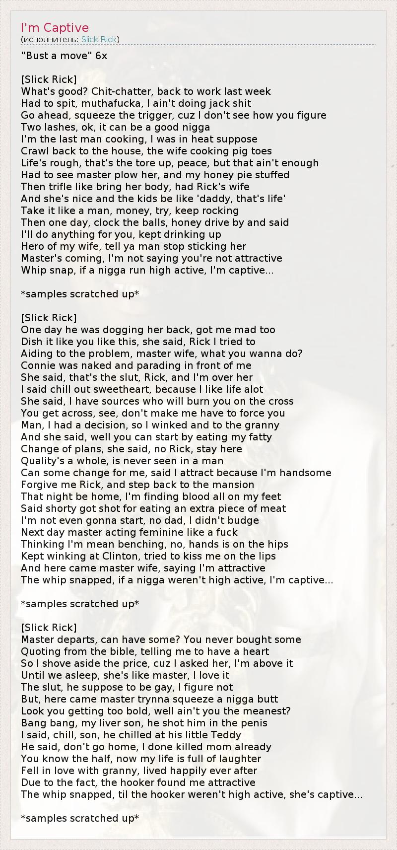 Это интересно:Slick Rick (также известный под псевдонимами MC Ricky D и The Ruler) настоящие имя Richard Walters, родился 14-го января 1965-го года в Лондоне, но начал свою музыкальную карьеру в Америке. В 1975-м году, он с семьёй переехал в Бронкс, Нью-Йорк, где встретил человека по имени Prince Charmz, который, как говорит сам Slick Rick, научил его читать рэп. Известности он добился благодаря серии треков записанных в 80-ых годах, таких как... продолжение
