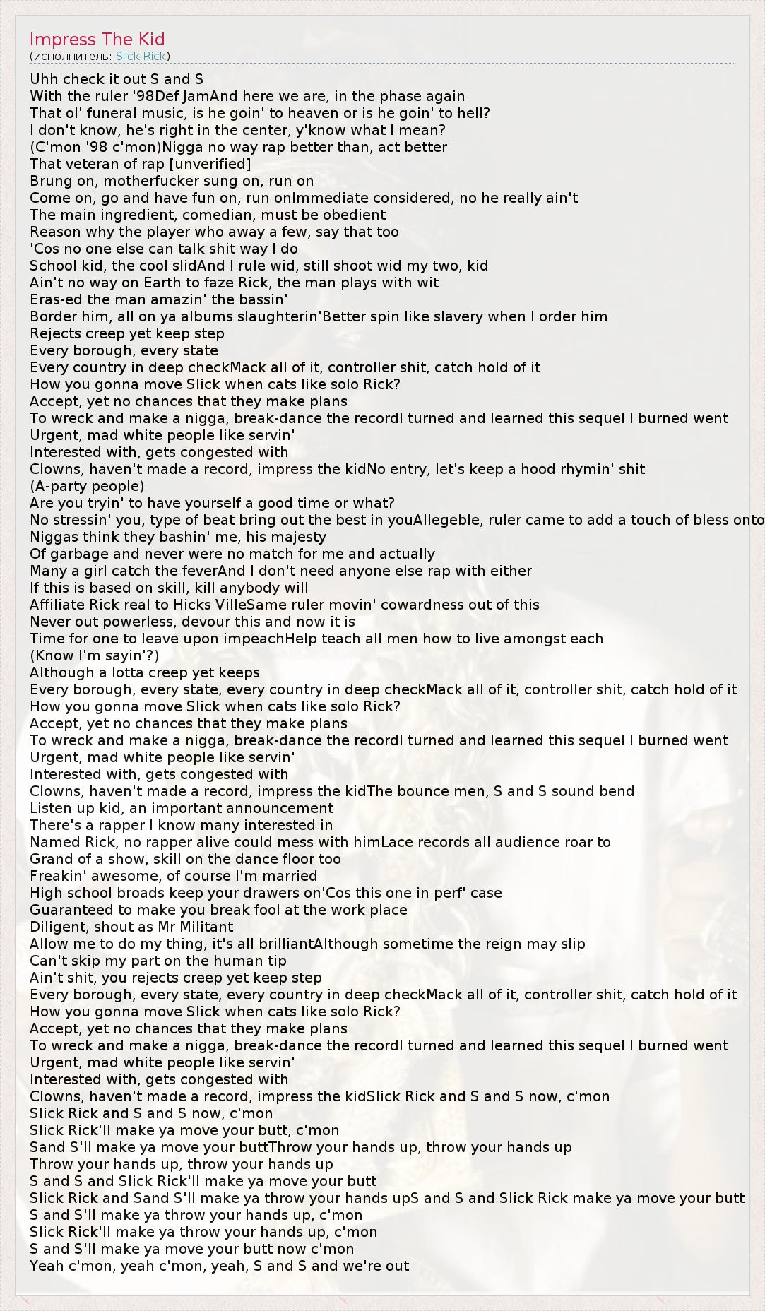 Это интересно:Slick Rick (также известный под псевдонимами MC Ricky D и The Ruler) настоящие имя Richard Walters, родился 14-го января 1965-го года в Лондоне, но начал свою музыкальную карьеру в Америке. В 1975-м году, он с семьёй переехал в Бронкс, Нью-Йорк, где встретил человека по имени Prince Charmz, который, как говорит сам Slick Rick, научил его читать рэп. Известности он добился благодаря серии треков записанных в 80-ых годах, таких как... продолжение