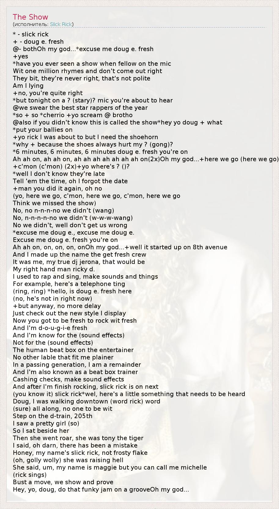 * - slick rick + - doug e. fresh @- bothOh my god...*excuse me doug e. fresh +yes *have you ever seen a show when fellow on the mic Wit one million rhymes and don't come out right They bit, they're never right, that's not polite Am I lying +no, you're quite right *but tonight on a ? (stary)? mic you're about to hear @we swear the best star rappers of the year *so + so *cherrio +yo scream @ brotho @also if you didn't know this is called the show*hey yo doug + what *put your ballies on +yo rick I was about to but I need the shoehorn *why + because the shoes always hurt my ? (gong)? *6 minutes, 6 minutes, 6 minutes doug e. fresh you're on Ah ah on, ah ah on, ah ah ah ah ah ah ah on(2x)Oh my god...+here we go (here we go) +c'mon (c'mon) (2x)+yo where's ? ()? *well I don't know they're late Tell 'em the time, oh I forgot the date +man you did it again, oh no (yo, here we go, c'mon, here we go, c'mon, here we go Think we missed the show) No, no n-n-n-no we didn't (wang) No, n-n-n-n-no we didn't (w-w-w-wang) No we didn't, well don't get us wrong *excuse me doug e., excuse me doug e. Excuse me doug e. fresh you're on Ah ah on, on, on, on, onOh my god...+well it started up on 8th avenue And I made up the name the get fresh crew It was me, my true dj jerona, that would be My right hand man ricky d. I used to rap and sing, make sounds and things For example, here's a telephone ting (ring, ring) *hello, is doug e. fresh here (no, he's not in right now) +but anyway, no more delay Just check out the new style I display Now you got to be fresh to rock wit fresh And I'm d-o-u-g-i-e fresh And I'm know for the (sound effects) Not for the (sound effects) The human beat box on the entertainer No other lable that fit me plainer In a passing generation, I am a remainder And I'm also known as a beat box trainer Cashing checks, make sound effects And after I'm finish rocking, slick rick is on next (you know it) slick rick*wel, here's a little something that needs to be heard Doug, I was walking downtown (word rick) word (sure) all along, no one to be wit Step on the d-train, 205th I saw a pretty girl (so) So I sat beside her Then she went roar, she was tony the tiger I said, oh darn, there has been a mistake Honey, my name's slick rick, not frosty flake (oh, golly wolly) she was raising hell She said, um, my name is maggie but you can call me michelle (rick sings) Bust a move, we show and prove Hey, yo, doug, do that funky jam on a grooveOh my god...