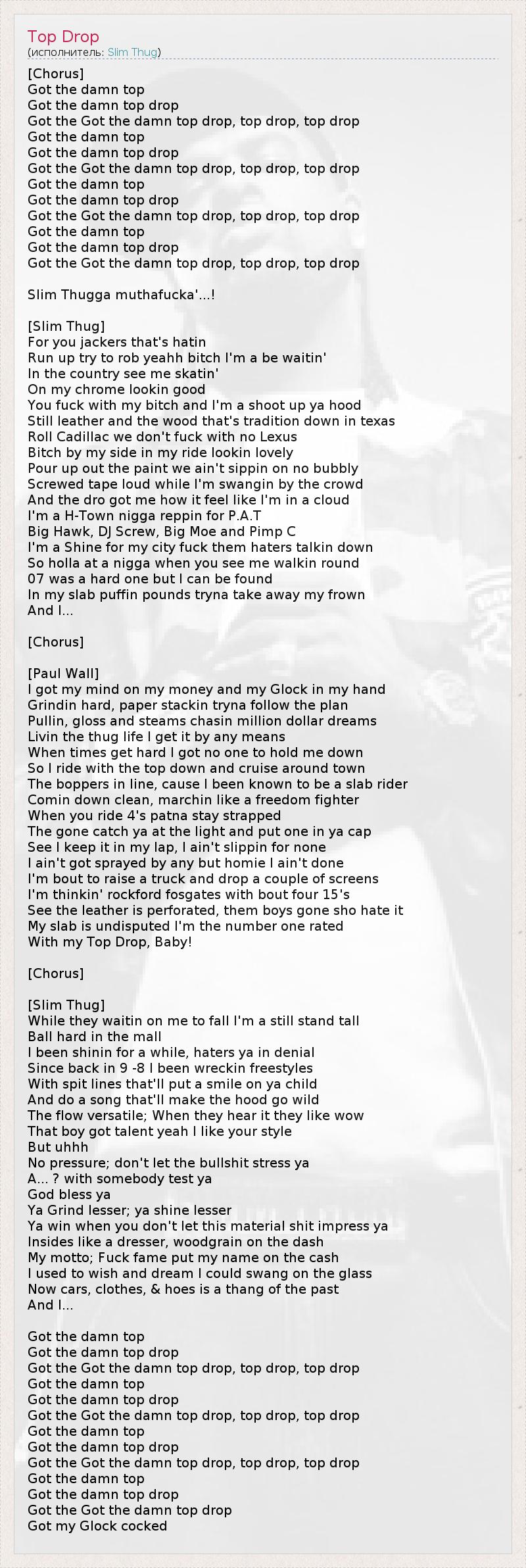 [Chorus] Got the damn top Got the damn top drop Got the Got the damn top drop, top drop, top drop Got the damn top Got the damn top drop Got the Got the damn top drop, top drop, top drop Got the damn top Got the damn top drop Got the Got the damn top drop, top drop, top drop Got the damn top Got the damn top drop Got the Got the damn top drop, top drop, top drop Slim Thugga muthafucka'...! [Slim Thug] For you jackers that's hatin Run up try to rob yeahh bitch I'm a be waitin' In the country see me skatin' On my chrome lookin good You fuck with my bitch and I'm a shoot up ya hood Still leather and the wood that's tradition down in texas Roll Cadillac we don't fuck with no Lexus Bitch by my side in my ride lookin lovely Pour up out the paint we ain't sippin on no bubbly Screwed tape loud while I'm swangin by the crowd And the dro got me how it feel like I'm in a cloud I'm a H-Town nigga reppin for P.A.T Big Hawk, DJ Screw, Big Moe and Pimp C I'm a Shine for my city fuck them haters talkin down So holla at a nigga when you see me walkin round 07 was a hard one but I can be found In my slab puffin pounds tryna take away my frown And I... [Chorus] [Paul Wall] I got my mind on my money and my Glock in my hand Grindin hard, paper stackin tryna follow the plan Pullin, gloss and steams chasin million dollar dreams Livin the thug life I get it by any means When times get hard I got no one to hold me down So I ride with the top down and cruise around town The boppers in line, cause I been known to be a slab rider Comin down clean, marchin like a freedom fighter When you ride 4's patna stay strapped The gone catch ya at the light and put one in ya cap See I keep it in my lap, I ain't slippin for none I ain't got sprayed by any but homie I ain't done I'm bout to raise a truck and drop a couple of screens I'm thinkin' rockford fosgates with bout four 15's See the leather is perforated, them boys gone sho hate it My slab is undisputed I'm the number one rated With my Top Drop, Baby! [Chorus] [Slim Thug] While they waitin on me to fall I'm a still stand tall Ball hard in the mall I been shinin for a while, haters ya in denial Since back in 9 -8 I been wreckin freestyles With spit lines that'll put a smile on ya child And do a song that'll make the hood go wild The flow versatile; When they hear it they like wow That boy got talent yeah I like your style But uhhh No pressure; don't let the bullshit stress ya A... ? with somebody test ya God bless ya Ya Grind lesser; ya shine lesser Ya win when you don't let this material shit impress ya Insides like a dresser, woodgrain on the dash My motto; Fuck fame put my name on the cash I used to wish and dream I could swang on the glass Now cars, clothes, & hoes is a thang of the past And I... Got the damn top Got the damn top drop Got the Got the damn top drop, top drop, top drop Got the damn top Got the damn top drop Got the Got the damn top drop, top drop, top drop Got the damn top Got the damn top drop Got the Got the damn top drop, top drop, top drop Got the damn top Got the damn top drop Got the Got the damn top drop Got my Glock cocked