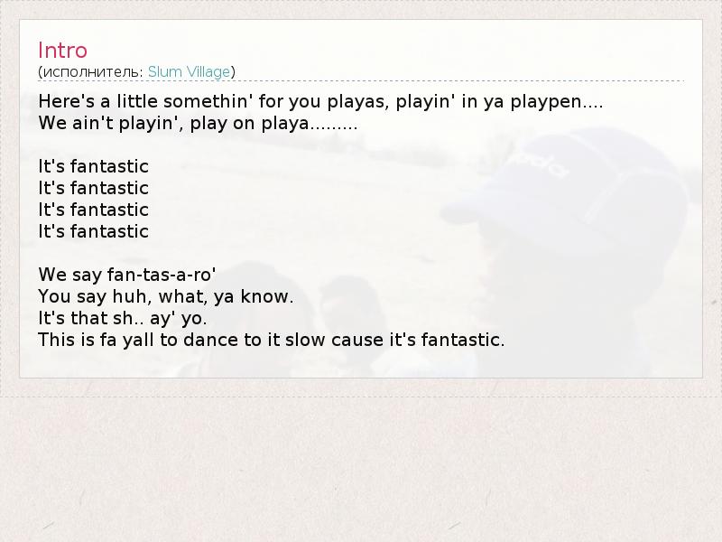 Это интересно:Slum Village - рэп группа из Детройта, штат Мичиган, повлиявшая на карьерный рост таких рэп исполнителей из Детройта, как Frank'N'Dank, Platinum, Pied Pipers и Black Milk.Группа Slum Village была образованна в 1988 году тремя закадычными друзьями: Baatin (настоящее имя Titus Glover), T3 (R.L. Altman) и Jay Dee (James Dewitt Yancey). Парни вместе выросли в одном районе Conant Gardens в окрестностях Детройта и ходили в одну школу.Благодаря упорству... продолжение