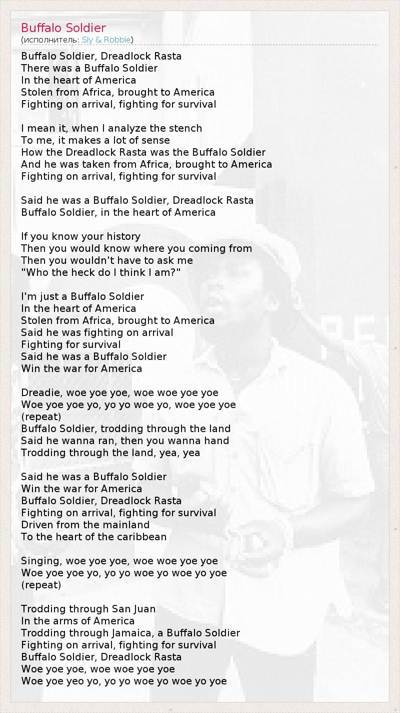 Солдат буффало 1, растаман с дредами. В сердце Америки Оказался солдат буффало, Угнанный из Африки, привезенный в Америку, Сражавшийся по прибытии, боровшийся за выживание. Говорю это не шутя, когда анализирую этот смрад. Для меня имеет большой смысл, Как растаман с дредами был солдатом буффало, И его забрали из Африки, привезли в Америку. Сражавшийся по прибытии, боровшийся за выживание... Он сказал, что был солдатом буффало, растаманом с дредами, Буффало солдатом в сердце Америки. Если бы ты знал свою историю, Тогда тебе были бы известны твои корни, Тогда тебе бы не приходилось меня спрашивать: "Да ты хоть знаешь, кто я, черт побери?" Я всего лишь солдат буффало В сердце Америки, Угнанный из Африки, привезенный в Америку. Он сказал, что дрался по прибытии, Боролся за выживание. Сказал, что был солдатом буффало, Победил в войне во имя Америки. Парнишка с дредами, ой-ёй-ёй, ой-ой-ёй-ёй, Ой-ёй-ёй-ё, ё-ё-ой-ё, ой-ёй-ёй (повтор) Солдат буффало, прошагавший по стране. Сказал, что хочет убежать, затем ты хочешь помочь, Шагая по стране, да, да. Он сказал, что был солдатом буффало, Победил в войне во имя Америки. Солдат буффало, растаман с дредами, Сражавшийся по прибытии, боровшийся за выживание, Привезенный с материка В самое сердце Карибского бассейна, Напевавший: "Ой-ёй-ёй, ой-ой-ёй-ёй, Ой-ёй-ёй-ё, ё-ё-ой-ё, ой-ё-ёй." (повтор) Прошедший через Сан-Хуан 2 В объятия Америки, Прошедший Ямайку, солдат буффало, Сражавшийся по прибытии, боровшийся за выживание. Солдат буффало, растаман с дредами. Ой-ёй-ёй, ой-ой-ёй-ёй, Ой-ёй-ёй-ё, ё-ё-ой-ё, ой-ё-ёй. 1 - прозвище служащего кавалерии Соединенных Штатов, преимущественно афроамериканца 2 - город в Аргентине
