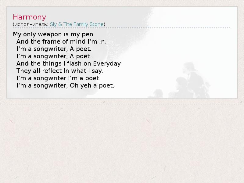 Это интересно:Сильвестр Стюарт родился 15 марта 1944 года в Техасе, а в 1950-м переехал вместе со своей семьей в Сан-Франциско. Музыкой он начал заниматься с самых ранних лет и уже в четыре года вместе с семейной группой "Stewart four" записал первый госпел. В высшей школе Сильвестр переименовался в Слая и занялся исполнением рок-н-роллов. Затем он устроился ди-джеем на ритм-энд-блюзовую радиостанцию, и его... продолжение