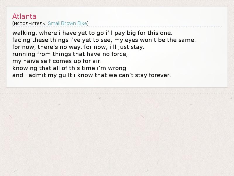 Это интересно:Small Brown Bike группа из города Маршалл, штата Мичиган (Соединенные Штаты) , основанная в 1996 году. Группа была образована участниками коллектива " Help! The Lookout" - фронтменом Майком Ридом, и его братом, бас-гитаристом Беном Ридом. Название группы происходит от их опыта работы в качестве механиков велосипедов.
