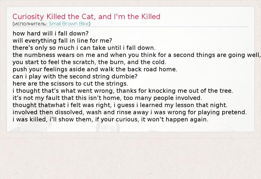 ГлавнаяИсполнителиSmall Brown BikeCuriosity Killed the Cat, and I'm the Killed