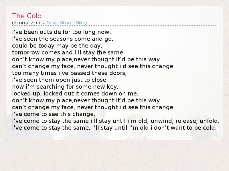 Это интересно:Small Brown Bike группа из города Маршалл, штата Мичиган (Соединенные Штаты) , основанная в 1996 году. Группа была образована участниками коллектива " Help! The Lookout" - фронтменом Майком Ридом, и его братом, бас-гитаристом Беном Ридом. Название группы происходит от их опыта работы в качестве механиков велосипедов.