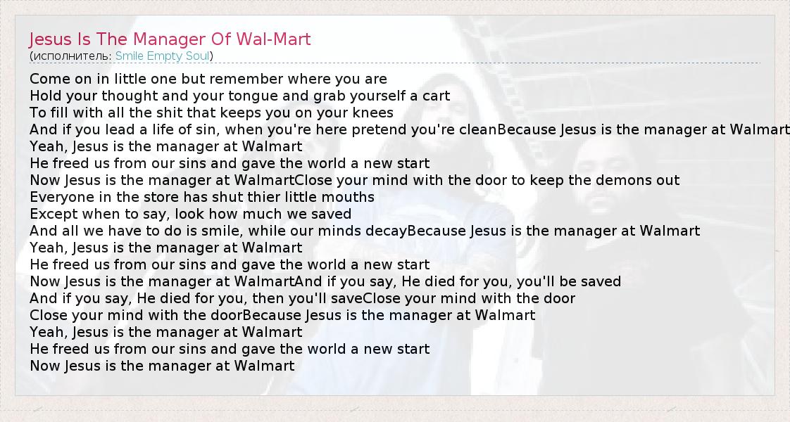 ГлавнаяИсполнителиSmile Empty SoulJesus Is The Manager Of Wal-Mart