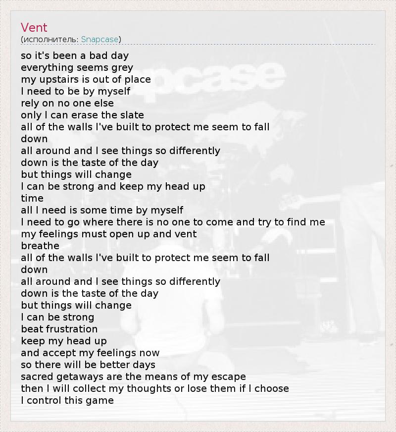 so it's been a bad day everything seems grey my upstairs is out of place I need to be by myself rely on no one else only I can erase the slate all of the walls I've built to protect me seem to fall down all around and I see things so differently down is the taste of the day but things will change I can be strong and keep my head up time all I need is some time by myself I need to go where there is no one to come and try to find me my feelings must open up and vent breathe all of the walls I've built to protect me seem to fall down all around and I see things so differently down is the taste of the day but things will change I can be strong beat frustration keep my head up and accept my feelings now so there will be better days sacred getaways are the means of my escape then I will collect my thoughts or lose them if I choose I control this game