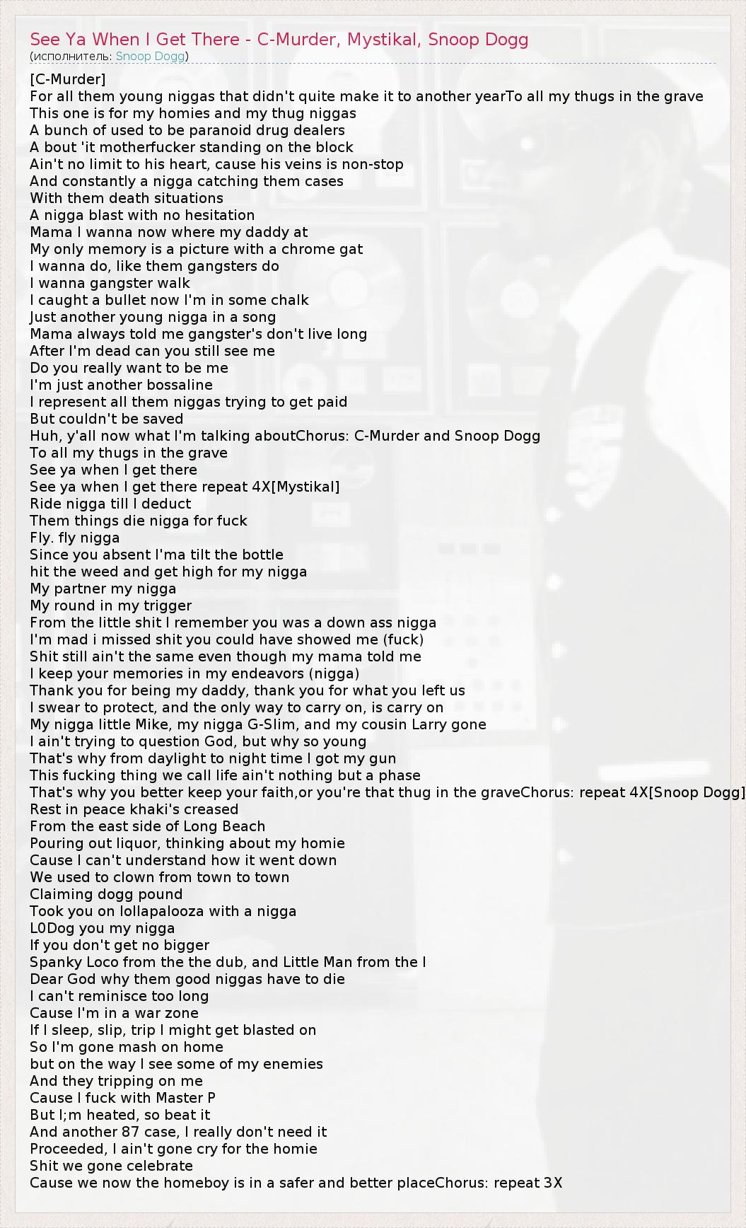ГлавнаяИсполнителиSnoop DoggSee Ya When I Get There - C-Murder, Mystikal, Snoop Dogg