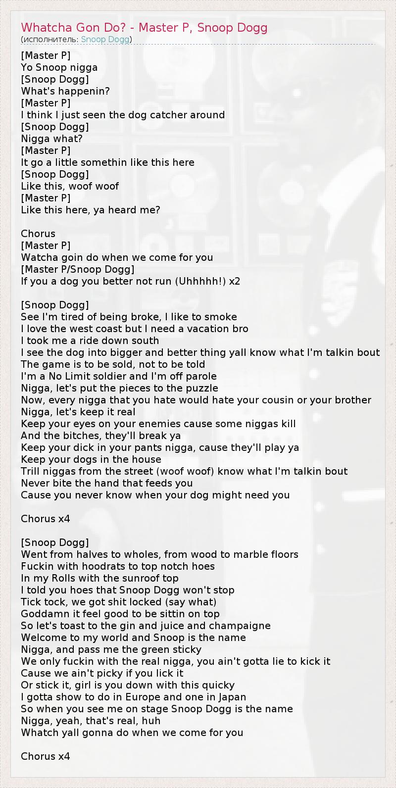 А как ты думаешь, о чем песня "Whatcha Gon Do? - Master P, Snoop Dogg" ?