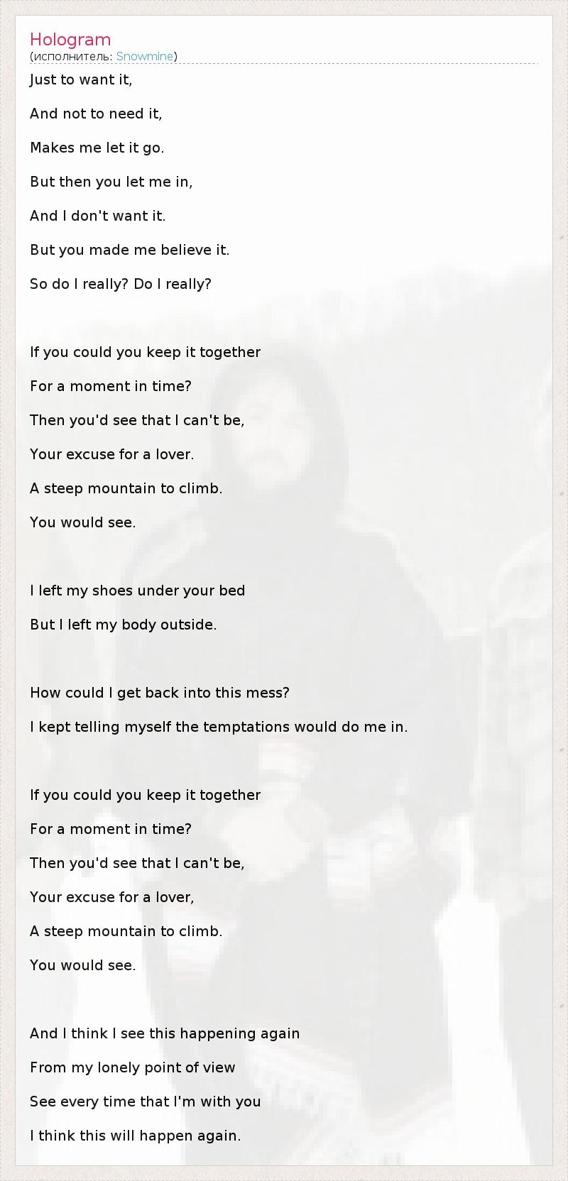 Just to want it, And not to need it, Makes me let it go. But then you let me in, And I don't want it. But you made me believe it. So do I really? Do I really? If you could you keep it together For a moment in time? Then you'd see that I can't be, Your excuse for a lover. A steep mountain to climb. You would see. I left my shoes under your bed But I left my body outside. How could I get back into this mess? I kept telling myself the temptations would do me in. If you could you keep it together For a moment in time? Then you'd see that I can't be, Your excuse for a lover, A steep mountain to climb. You would see. And I think I see this happening again From my lonely point of view See every time that I'm with you I think this will happen again.