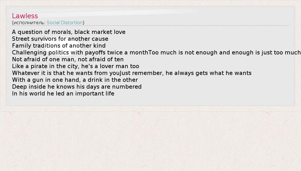 Это интересно:Одна из самых первых и самых легендарных калифорнийских панк-банд Social Distortion отсчитывают свою историю с 1978 года, когда друзья-школьники гитарист Mike Ness (3.04.62), барабанщик Casey Rover, и братья Agnew по имени Rick (вокал, гитара) и Frank (бас) собрались на первую совместную репетицию. Играть в в панк-группе было, конечно, увлекательней, чем учить уроки, но коллектив это не сильно сплотило состав продержался... продолжение